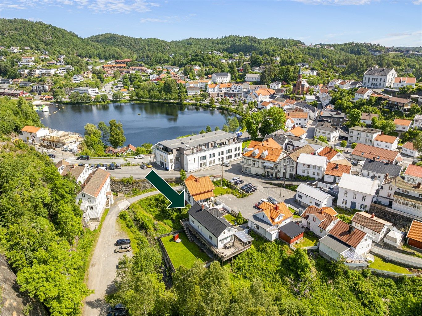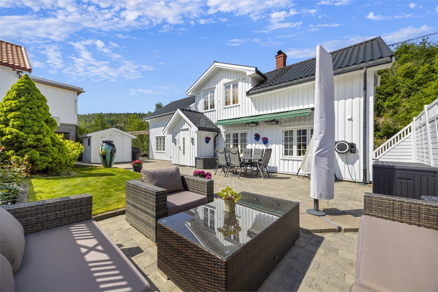 Modernisert enebolig i Sørlandsstil, passe tilbaketrukket fra sentrum med stor uteplass og parkering. Dette huset ligger fantastisk til i enden av Hovedgata og byr på flere uteplasser med brostein, plen, hage og terrasser. Det er ca. 600 meter fra huset og ned til sentrumshavna, her har man gangavstand til det meste. Boligen er velholdt med flere gode kvaliteter og oppgraderinger i nyere tid. Uteområdet ble opparbeidet med mur og brostein i 2020. Eiendommen er meget innholdsrik med uteplasser på tre av sidene og sol fra morgen til ca. kl. 21:00 midtsommers.