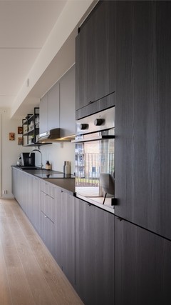 Boligens HTH-kjøkken er i en åpen løsning mot stuen og gir et sosialt allrom. Kjøkkenet er godt utnyttet med mye skap, skuffer og benkeplass. Kjøkkeninnredningen har benkeskap i mørk trestruktur og grå overskap. Slitesterk benkeplate i laminat med nedfelt kjøkkenvask. Det er montert belysning og stikkontakter under overskapene. Stuen og kjøkkenet danner et stort og sosialt allrom. Det er integrerte hvitevarer - nedfelt induksjonstopp, oppvaskmaskin, stekeovn og kjøleskap med fryser. Det er ventilator som er tilkoblet avtrekk over platetoppen. Kjøkkenet har lekkasjestopper og komfyrvakt. Det er avsatt plass til et stort spisebord og sofagruppe som deler rommet i ulike soner. Flere store vinduer som slipper inn rikelig med naturlig lys. Prikken over I'en er den store balkongen som strekker seg langs oppholdsrommet.
