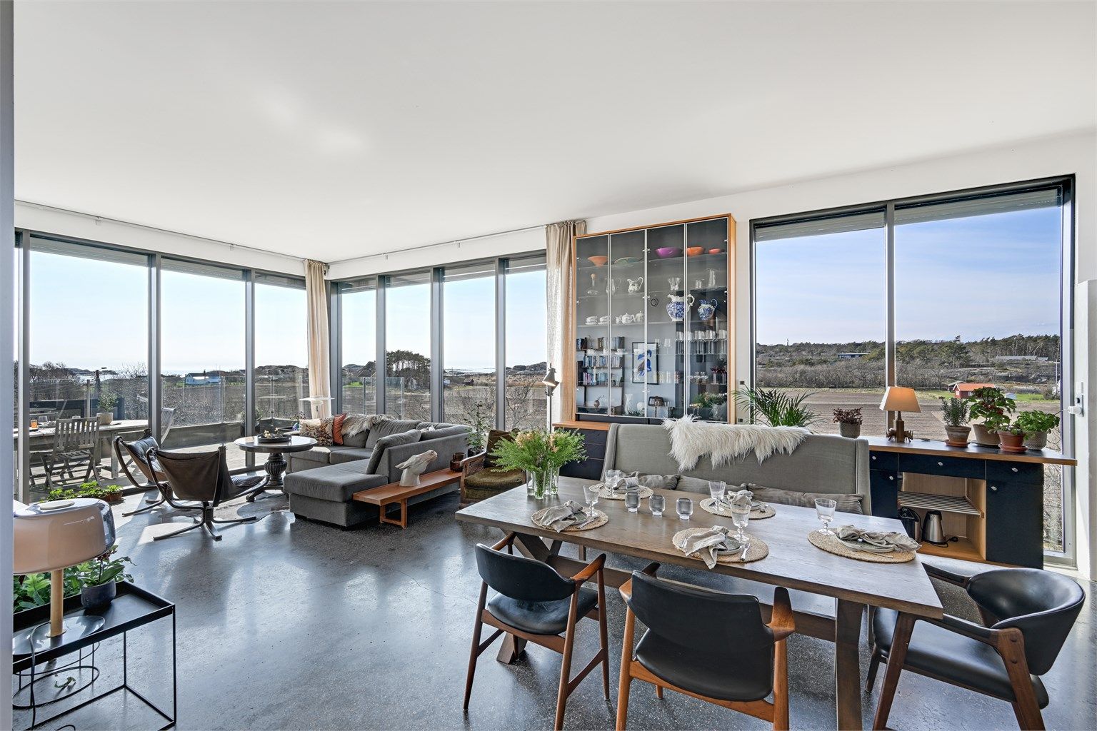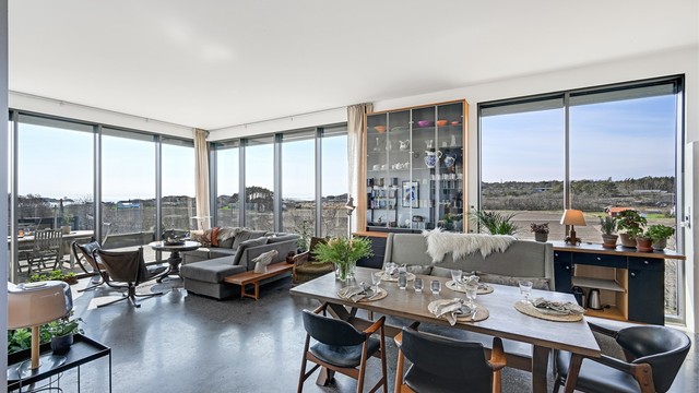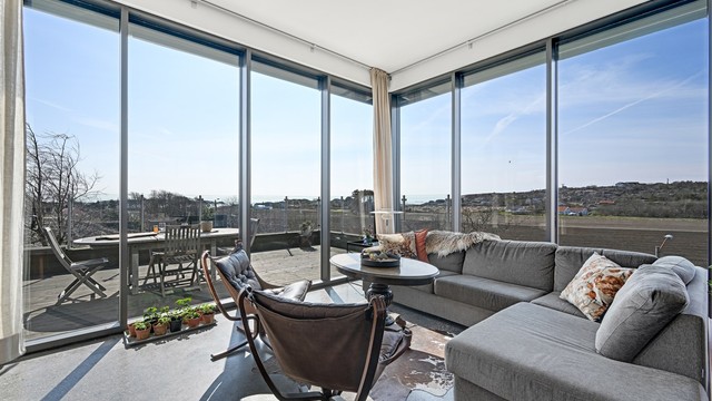 Boligen imponerer med rene linjer, betong og store vindusflater fra gulv til tak som slipper naturen helt inn. De solrike terrassene gir perfekte soner for både ro og sosiale øyeblikk, mens toppetasjen byr på en egen, privat oase med magisk sjøutsikt!