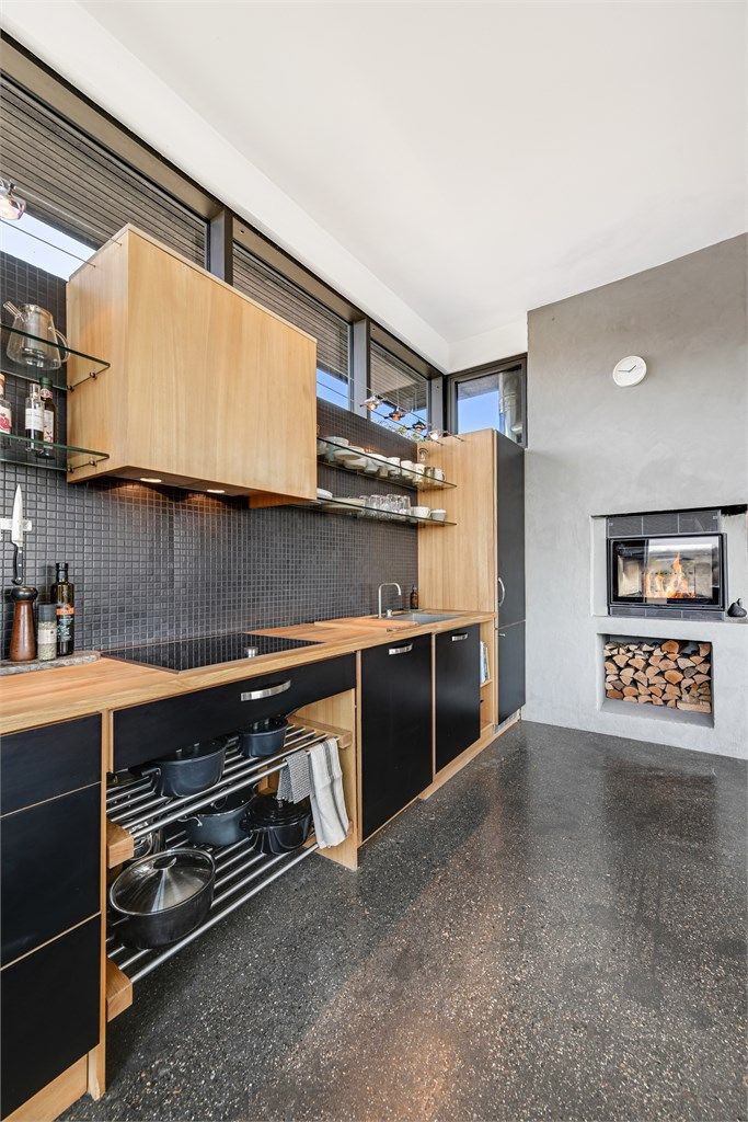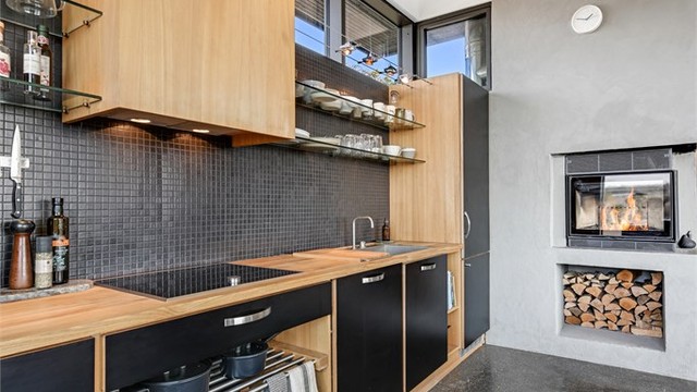 - Overflater og innredning: Det er registrert noe skjevhet i skapfrontene samt slitasjemerker i benkeplaten. I tillegg er det registrert skjevheter i de flislagte veggplatene bak glasshyllene mellom overskapene. Årsaken til skjevhetene i veggplatene er at platen, som er limt med et skumprodukt, har løsnet fra betongen bak.