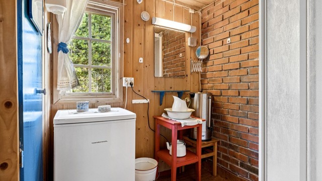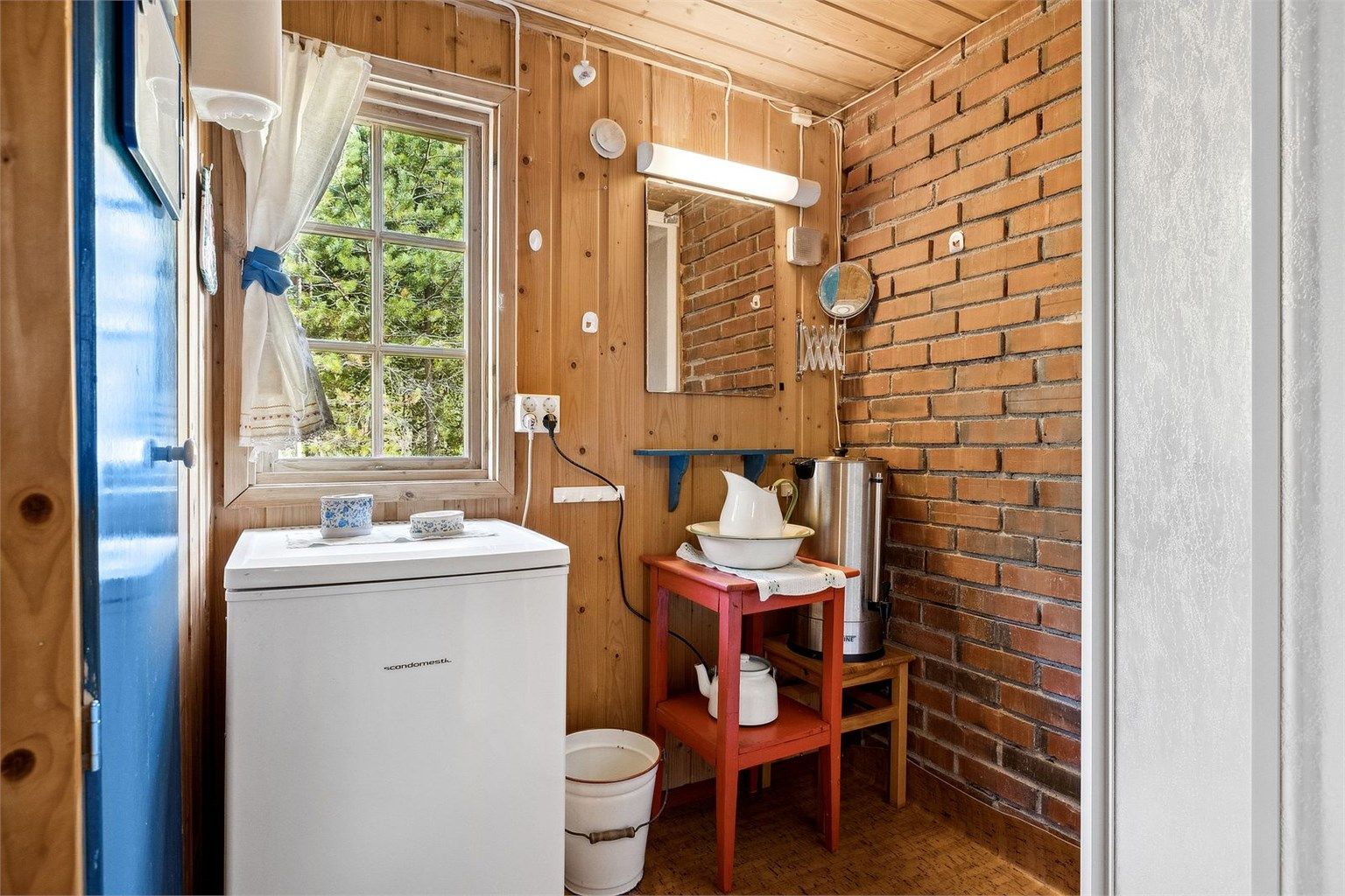 Hytta har et trivelig, overbygget inngangsparti som gir en god velkomst. Fra entréen er det adkomst til rom med hyttedo og praktisk bod. Stuen fremstår som lun og innbydende, med furugulv og trepanel på vegger og i himling. Gode vindusflater slipper inn fint med dagslys og gir en luftig romfølelse. Her er det naturlig plass til både sofagruppe og spisebord, og vedovnen bidrar med god varme på kalde dager.