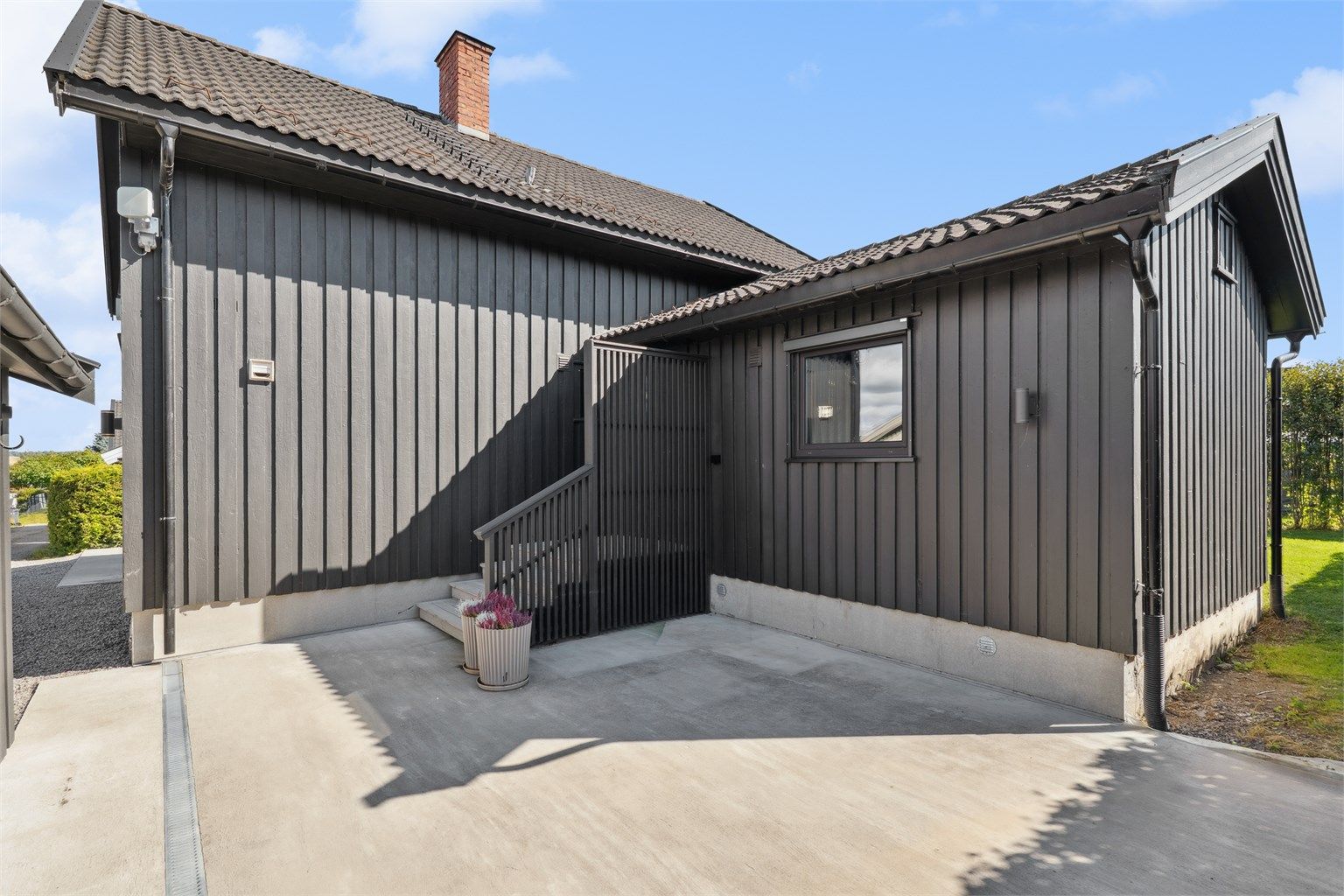 Eiendommen ligger skjermet til og har fine og solrike uteplasser. Boligen strekker seg over to plan pluss kjeller, og er innredet med tre soverom, to bad, toalettrom, ei lys og fin stue/spisestue og et romslig kjøkken. Kjeller med god plass til lagring.
