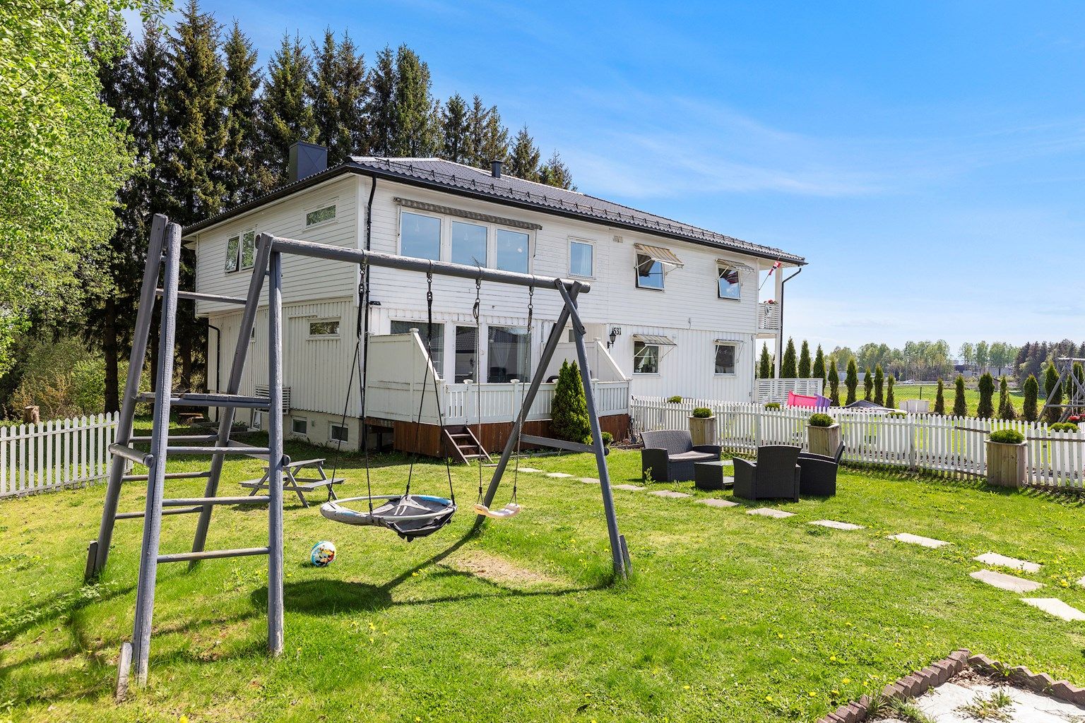 Stor og solrik terrasse og hage