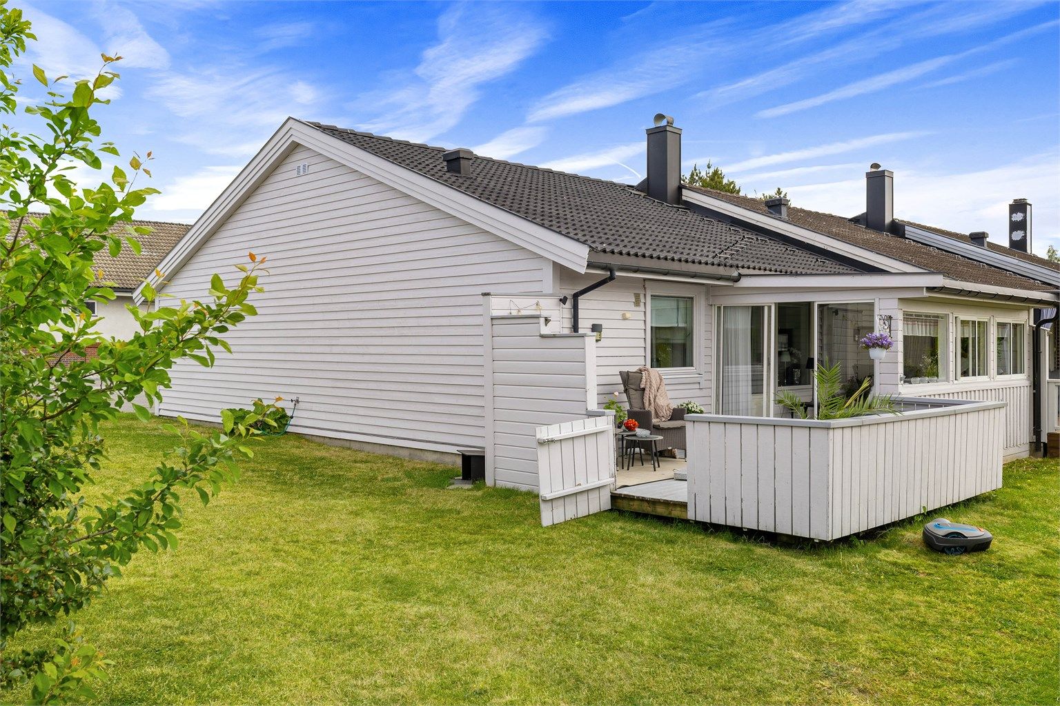 Praktisk enderekkehus med alt på én flate. Solfylt terrasse med hagestue. Biloppstillingsplasser rett foran døren.
