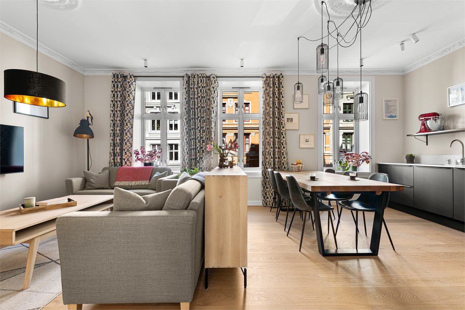Leiligheten ble pusset opp i 2021 og har flotte detaljer som takrosett, stukkatur og god takhøyde, kombinert med en ny peis og tidsriktige overflater.