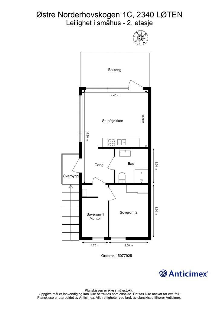 2. etasje 44 kvm: Entré/Gang, bad, to soverom og kjøkken/stue.