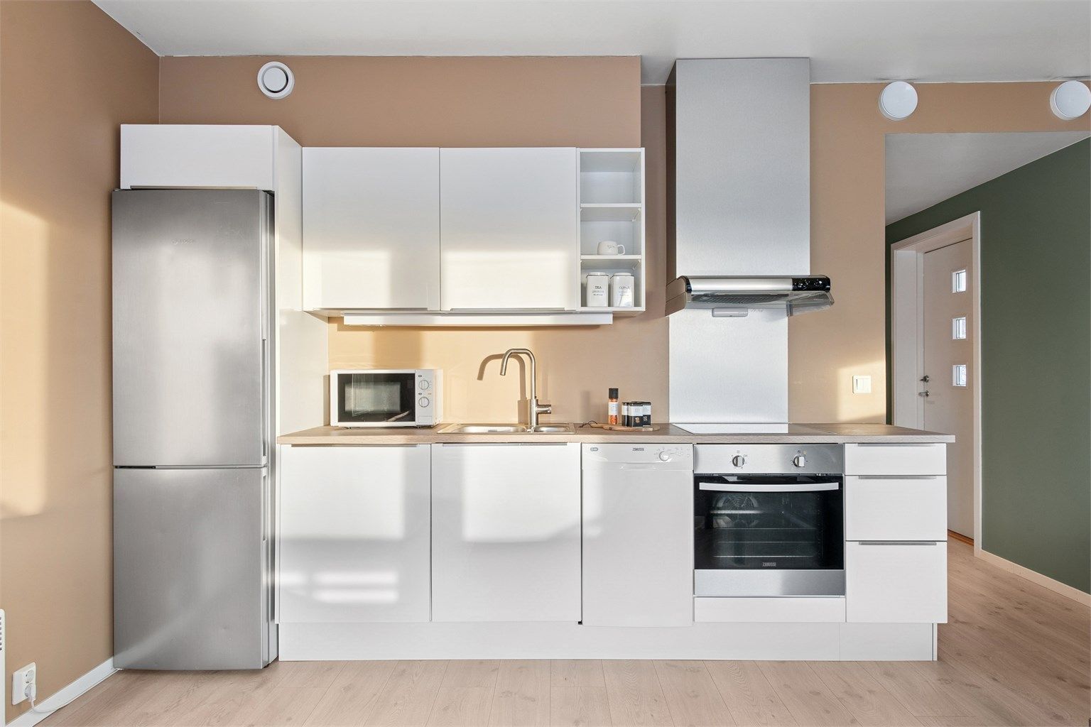 Åpen kjøkkenløsning med innredningen er fra byggeår. Innredning med glatte fronter, benkeplate av laminat og nedfelt oppvaskkum. Gulvflater belagt med parkett, vegg og himlingsflater i malte flater og metallplate mellom platetopp og overskap. Varmtvannsbereder er plassert under kjøkkenbenk. Integrert stekeovn, platetopp og oppvaskmaskin. Frittstående kjøleskap med fryser. Vegghengt ventilator. Det er kun de hvitevarene som er listet opp som følger med. Disse hvitevarene følger med: platetopp, komfyr, kjøleskap med fryser og oppvaskmaskin.