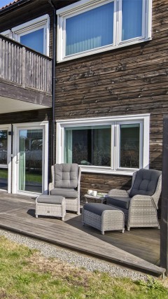 De store vindusflatene og utgang til terrassen knytter rommet til uteområdet. Terrassen er vestvendt, på hele 26 m² og er delvis overbygd. Her er det god plass til flere møbelgrupper. I tillegg har man bruksrett på hagen, som er naturlig tilliggende.