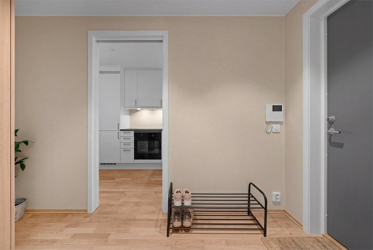Moderne kjøkken fra 2024 med innredning med glatte fronter og laminat benkeplate. Integrerte hvitevarer inkluderer kjøl/fryseskap, oppvaskmaskin, induksjonstopp og stekeovn. Kjøkkenet er utstyrt med komfyrvakt og avtrekk via balansert anlegg. Det gjøres oppmerksom på at hvitevarene er fra 2024, og kjøper må forvente slitasje som følge alder og normal bruk.