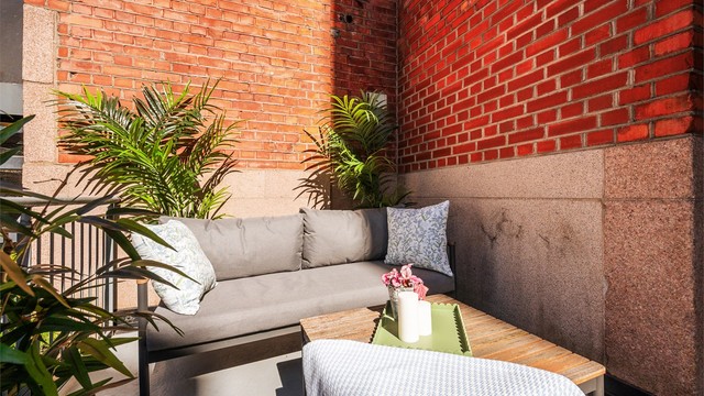 Fra stuen er det utgang til en romslig, nordvestvendt terrasse på 12 kvm. Her er det god plass til sittegruppe, grill og planter. I 2024 sørget borettslaget for å plante tujahekker utenfor terrassene for å skjerme for innsyn.