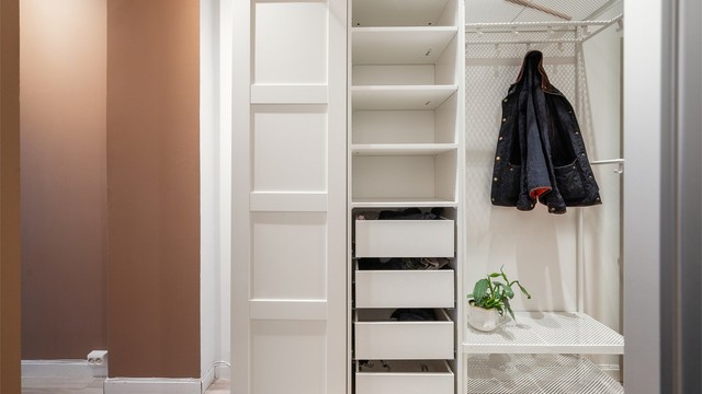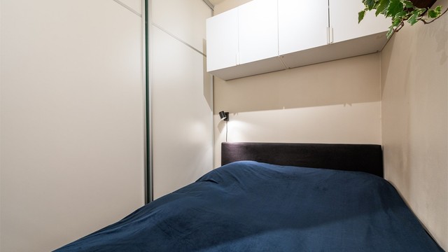Leilighetens planløsning legger til rette for en praktisk alkove/sovesone ved entréen. Alkoven har plass til stor dobbeltseng og garderobskap. Det er også lagt til rette for rikelig med oppbevaring i nærliggende garderobeskap i gangen.