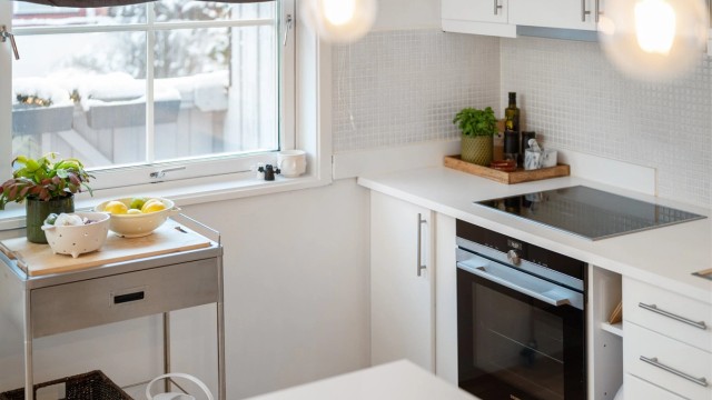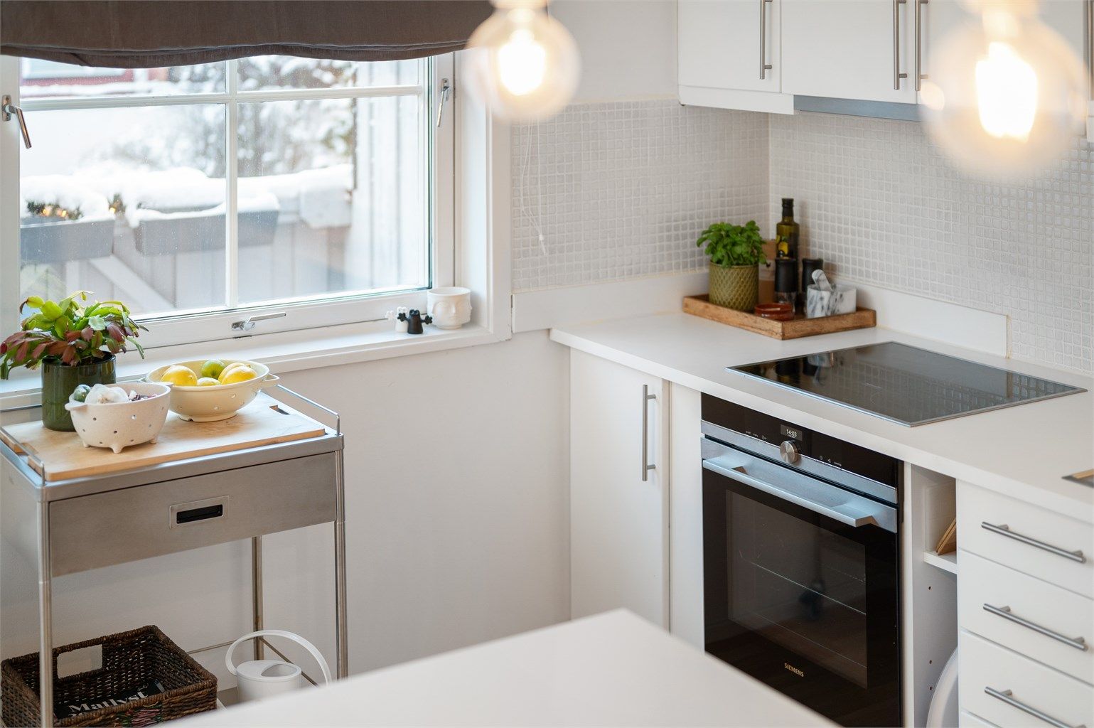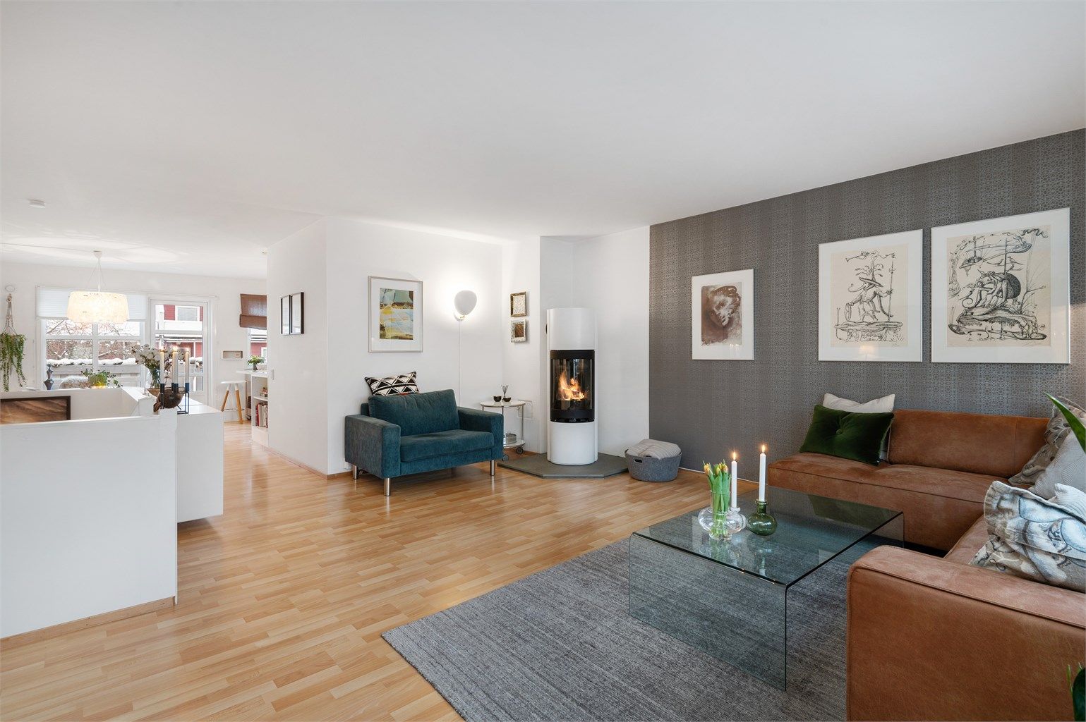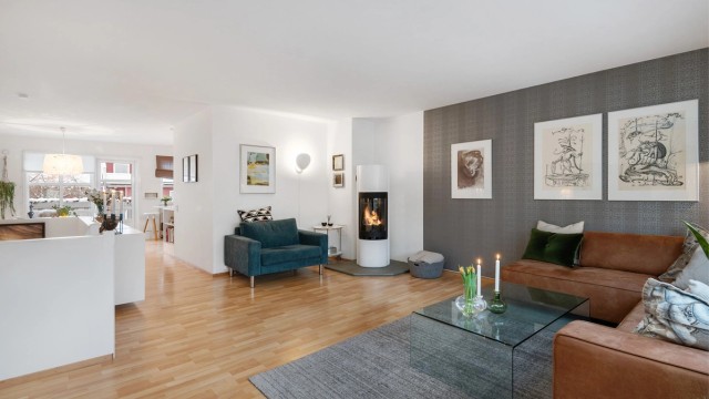 Store deler av boligen ble innvendig renovert i 2013. Stue og kjøkken ligger i delvis åpen løsning, der kjøkkenet har adkomst til en lun altan og stua vender blikket mot peisen. På stua er det også en fransk balkong, og innenfor kjøkkenet er en praktisk bod/grovkjøkken med ekstra skap- og benkeplass samt kjøl/frys og sentralstøvsuger.