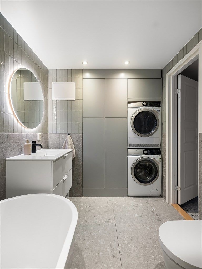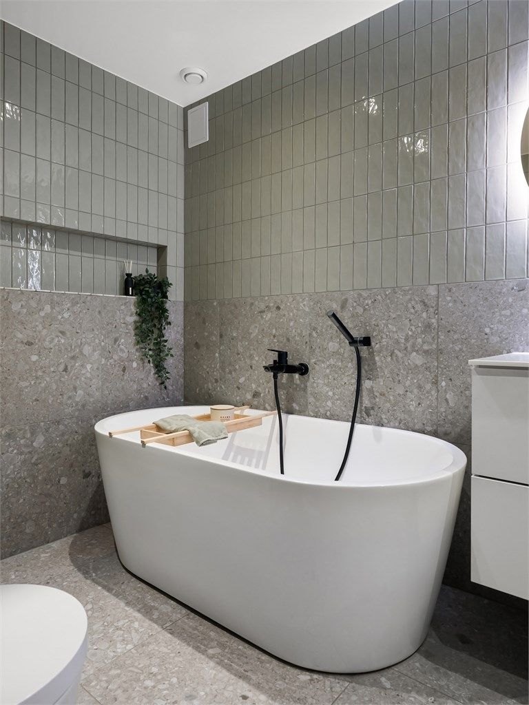Delikat baderom fra 2021 med fliser på gulv med gulvvarme, fliser på vegger, malt himling med downlights, vegghengt toalett, servant, dusjhjørne, badekar og opplegg for vaskemaskin. Varmtvannsbereder er plassert på badet.