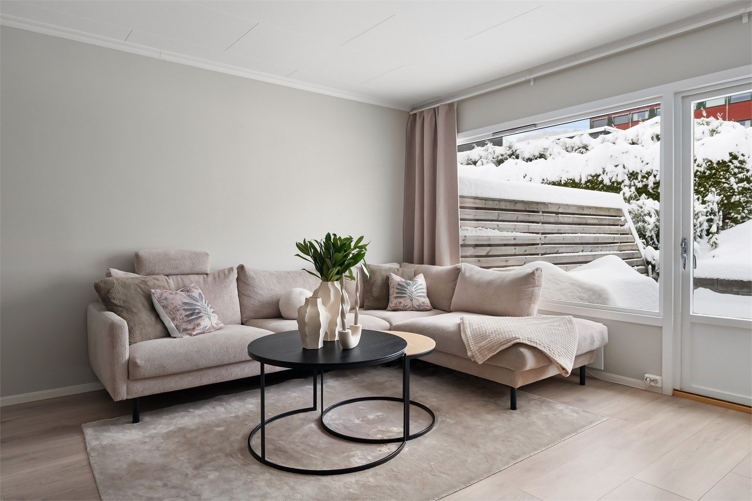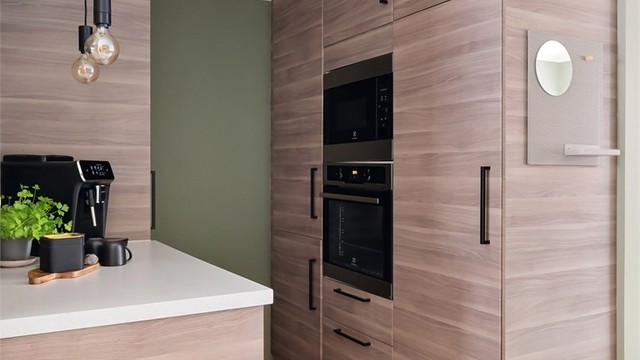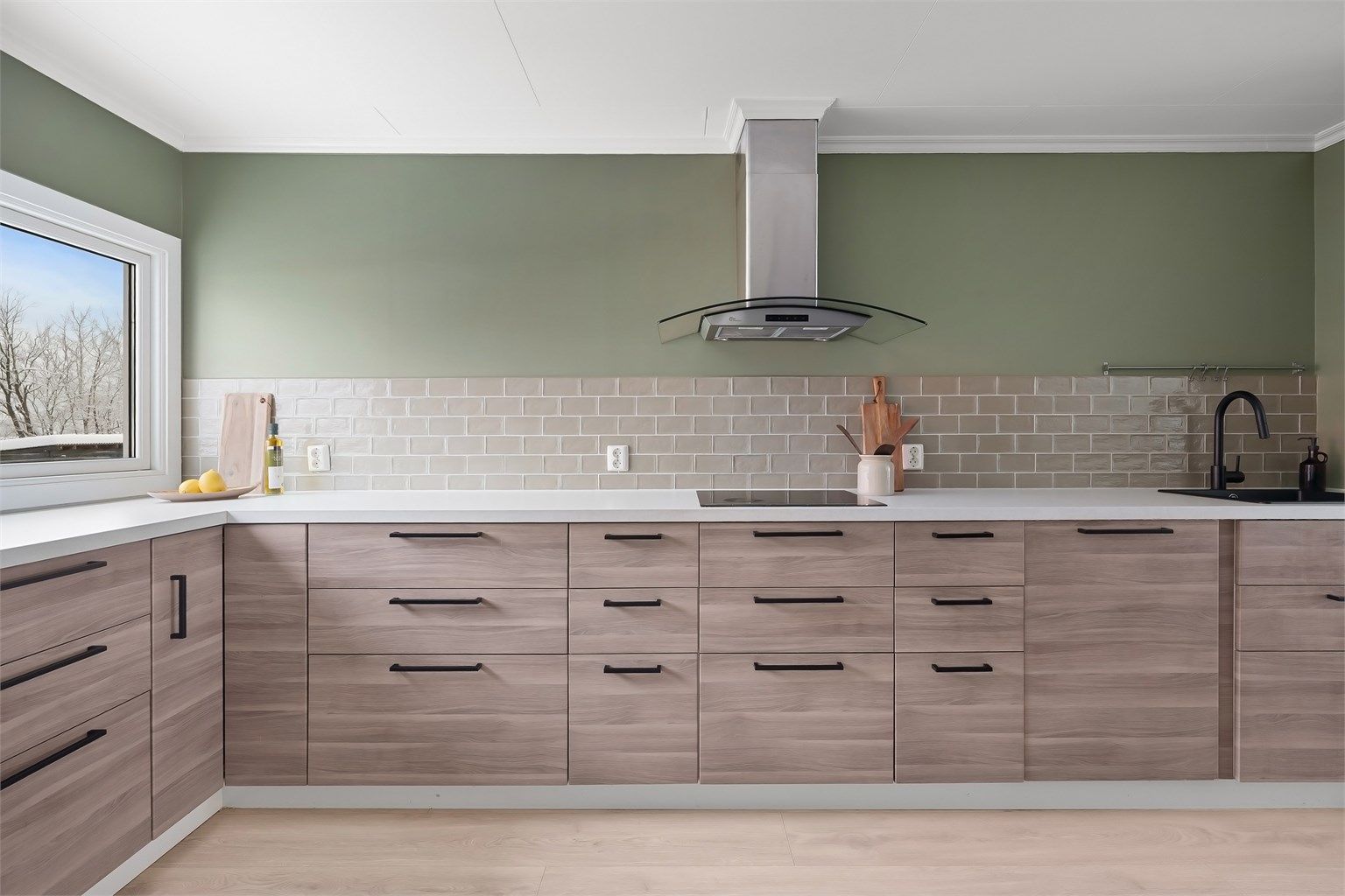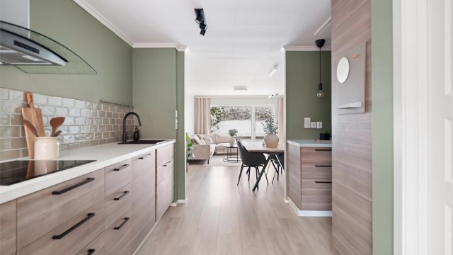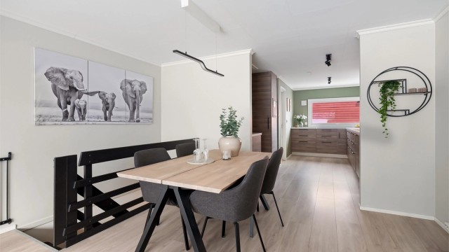 Innbydende og hyggelig stue med store vindusflater og rikelig med naturlig lys. Stuen har gode møbleringsmuligheter med plass for sofagruppe, TV-seksjon, spisegruppe og annet passende møblement. I åpen løsning mot stuen finner vi et pent kjøkken fra 2014 med glatte fronter på skap og skuffer, benkeplate av laminat med nedsenket oppvaskkum, integrerte hvitevarer som induksjonsplatetopp, stekeovn, oppvaskmaskin, kjøleskap og fryser.