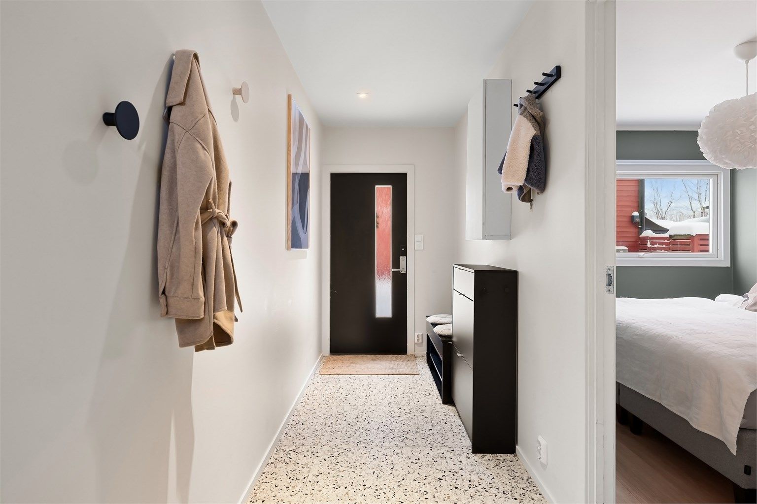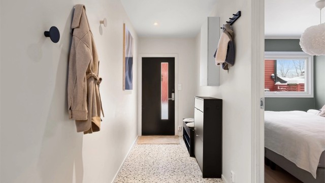 Hyggelig og romslig entré med skyvedørsgarderobe og god plass for yttertøy.