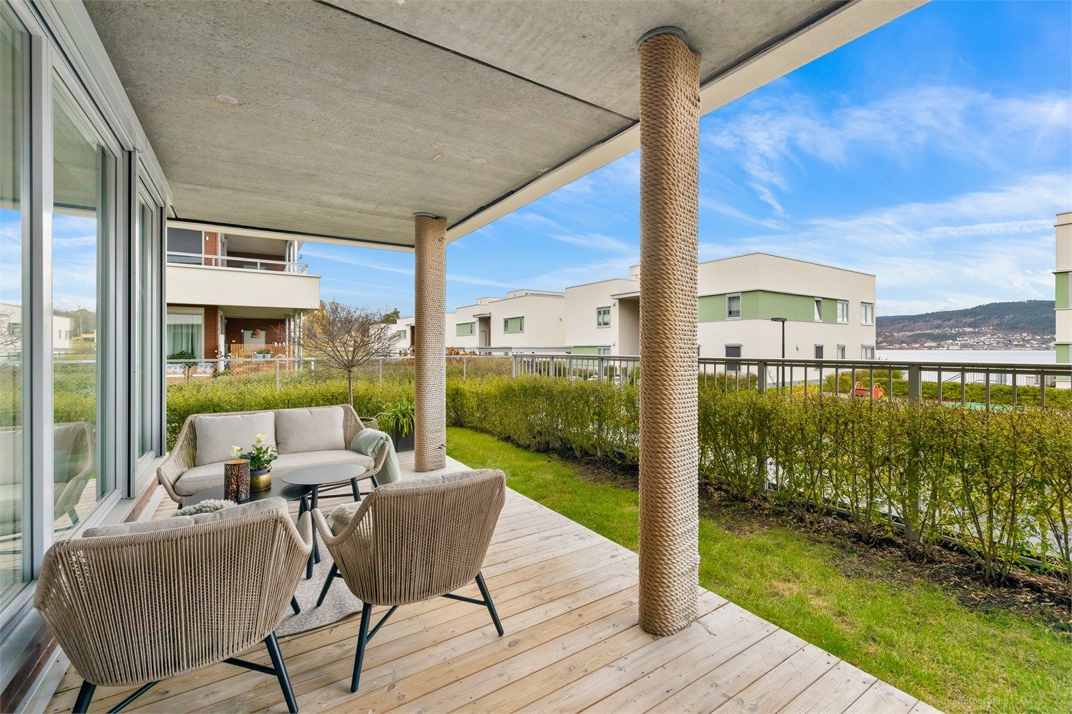 - Terrassen har gode solforhold og utsikt mot fjorden