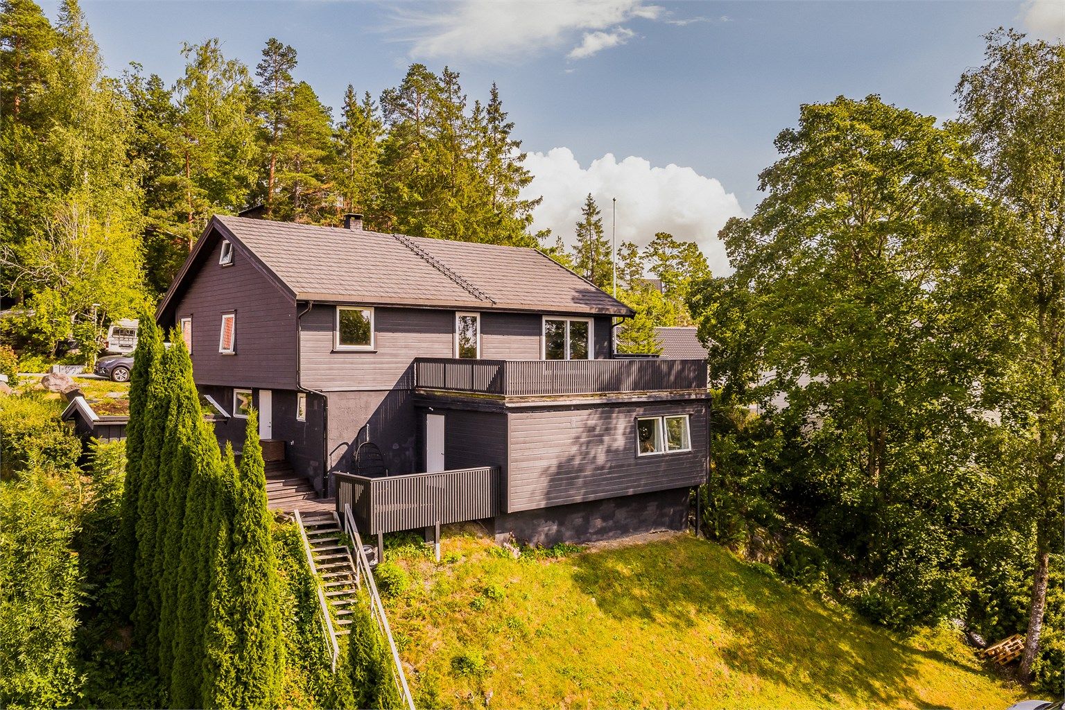 Hybelen har egen inngang, egen terrasse og flere biloppstillingsplasser på den nedre delen av tomten.