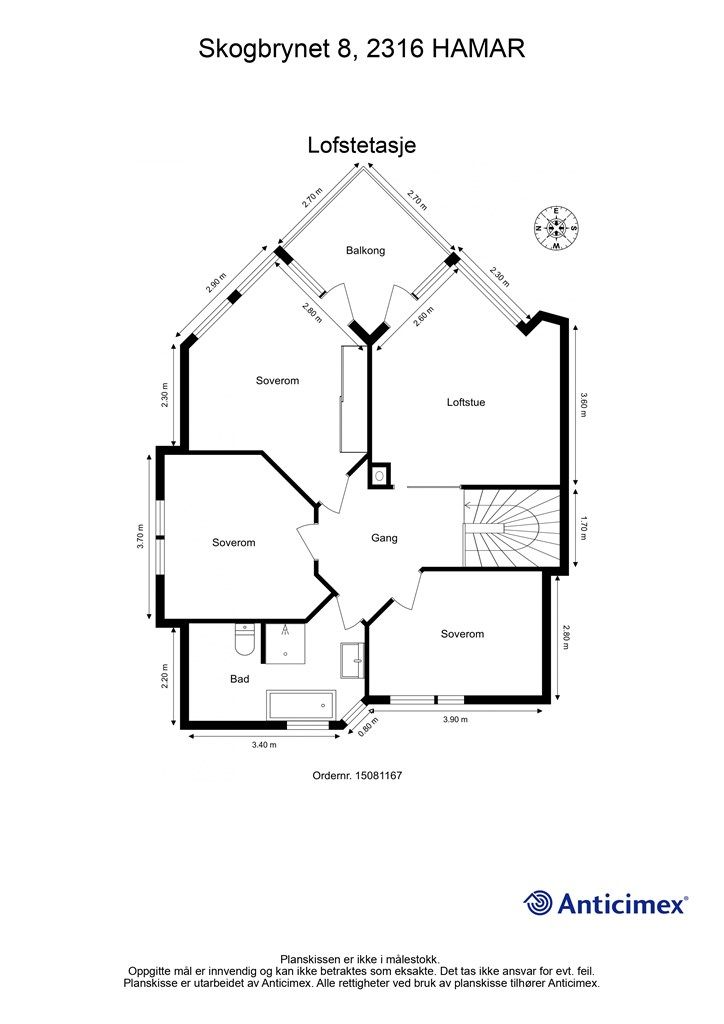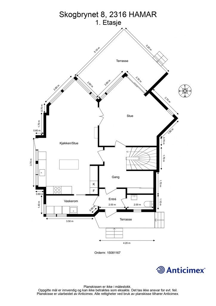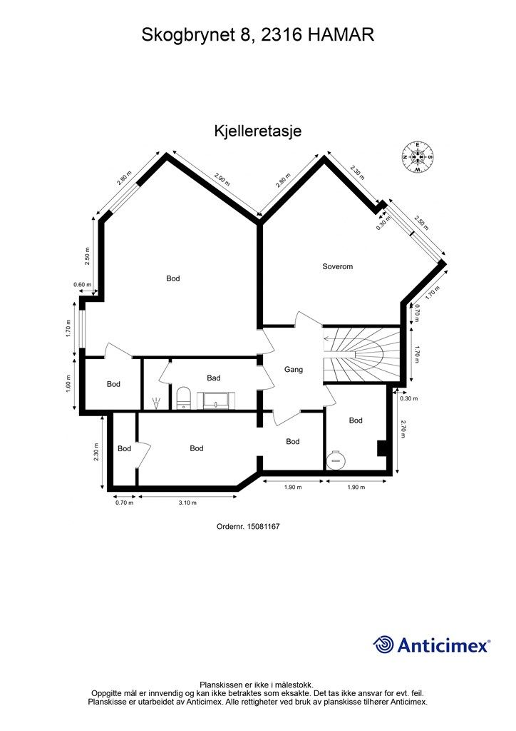 Vedlagte plantegninger er ikke målbare. De oppgitte arealer er hentet fra rapport med befaringsdato 14.04.2025 utført av Anticimex v/Karl Even H. Brukvangen. Arealene er beregnet og rom er definert etter dagens faktiske bruk, uavhengig av hva som er godkjent av bygningsmyndighetene.