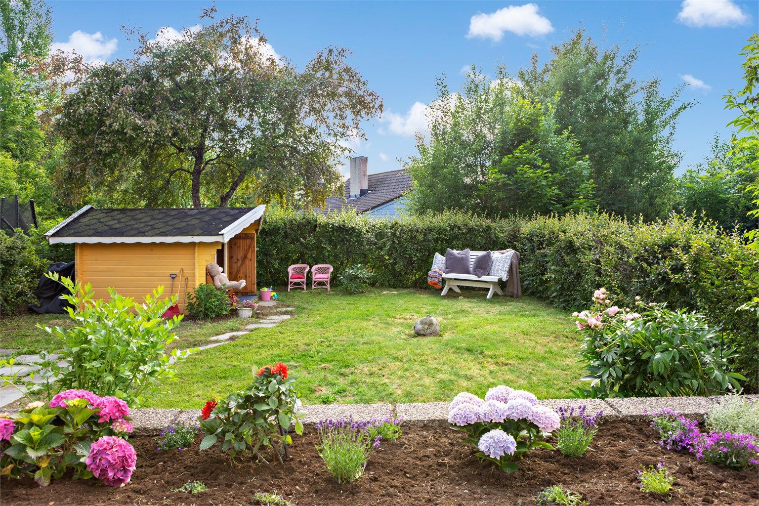 - Østvendt hage foran huset og vestvendt hage på baksiden. Koselig lekehus i hagen.
