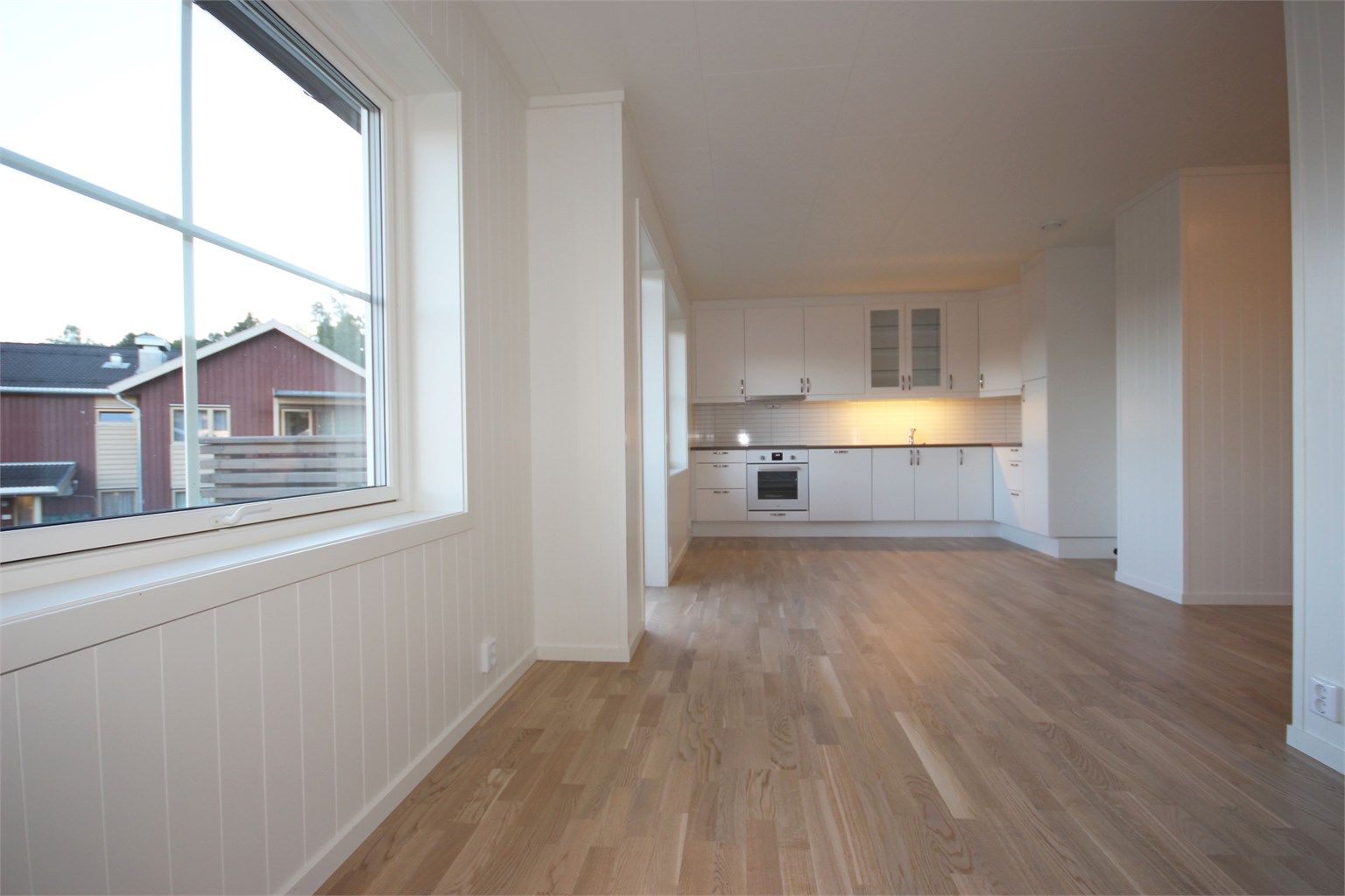 Pent og moderne kjøkken med hvite glatte fronter levert av Nybo. Godt med både benke og skapplass. Integrert komfyr med platetopp og oppvaskmaskin medfølger.