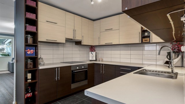 Boligen har en gjennomgående og normal standard med gulvoverflater av heltre og flis, vegger med brystningspanel og malte slette flater og himling med melte slette flater. Stue med god størrelse, som har direkte utgang til terrasse og plass til både sofakrok og spisestue innredning. Fint kjøkken med slette fronter og laminert benkeplate med nedsenket oppvaskkum. Kjøkkenet er innredet med integrert stekeovn, platetopp, oppvaskmaskin og ventilator i overskap. Det gjøres oppmerksom på at hvitevarene er kjøpt for noen år tilbake, og kjøper må forvente slitasje som følge alder og normal bruk. Bad med flislagt gulv og vegger og himling med malte plater. Badet er innredet med baderoms innredning med slette fronter og heldekkende servant, dusjkabinett, toalett og opplegg til vaskemaskin. To soverom hvorav ett er innredet som kontor i dag.