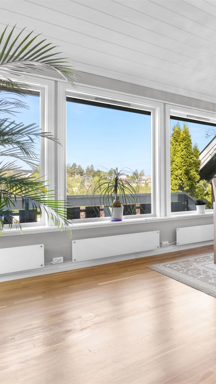 Stue: Romslig stue med plass til flere soner som sofaløsning, lesekrok og spisebord m.m. Det er vinduer fra 3 sider som gir mye lys. Store vinduer mot panoramautsikt. Det er litt over 3 meter takhøyde i stuen som gjør den enda mer luftig. Peis med dører. Utgang fra stue og kjøkken til vestvendt terrasse målt til 34m². Det er montert automatiske persienne på utsiden av stue.