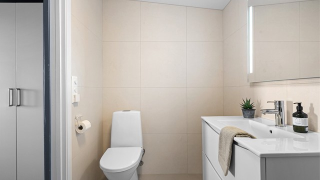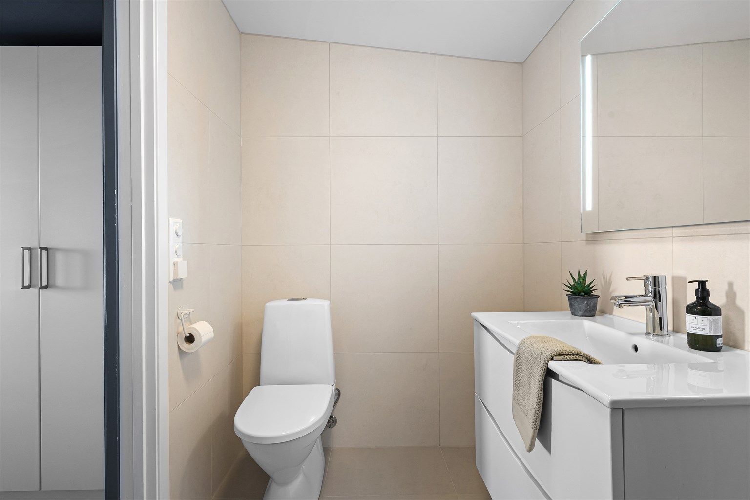 Badet ble totalrenovert i 2019. Flislagt gulv med gulvvarme og flislagte vegger. Utstyrt med gulvstående toalett, vegghengt servant med armatur, speil med sidelys og dusjhjørne med dører. Vannrør av type rør-i-rør og synlige avløpsrør i plast er fra byggeår. Mekanisk avtrekk.
