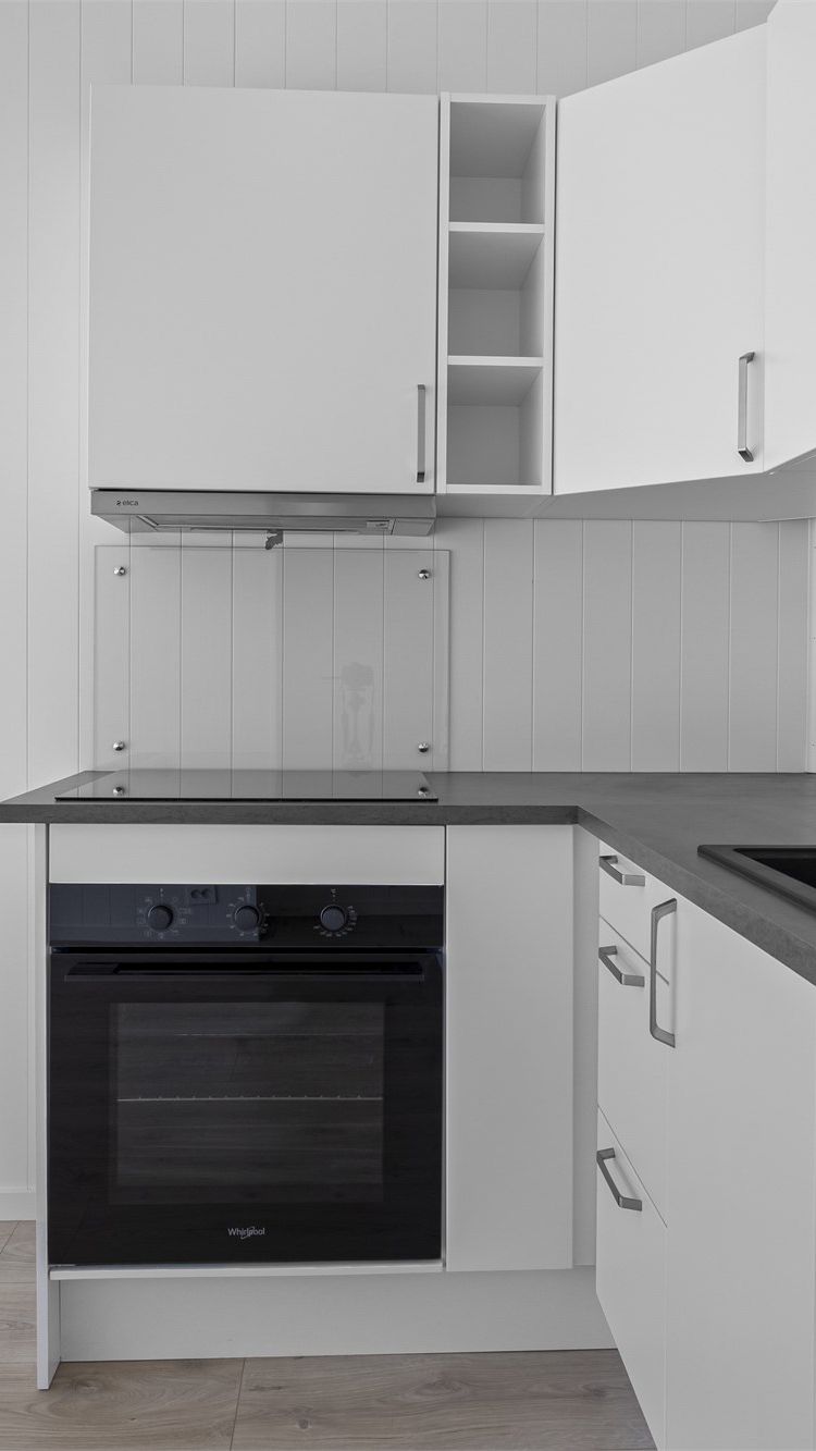 Innredning med glatte fronter og benkeplate i laminat. Integrert kjøl/fryseskap, oppvaskmaskin, induksjonstopp og stekeovn. Installert vannstoppsystem og komfyrvakt. Ventilasjon via kjøkkenventilator med kullfilter.
