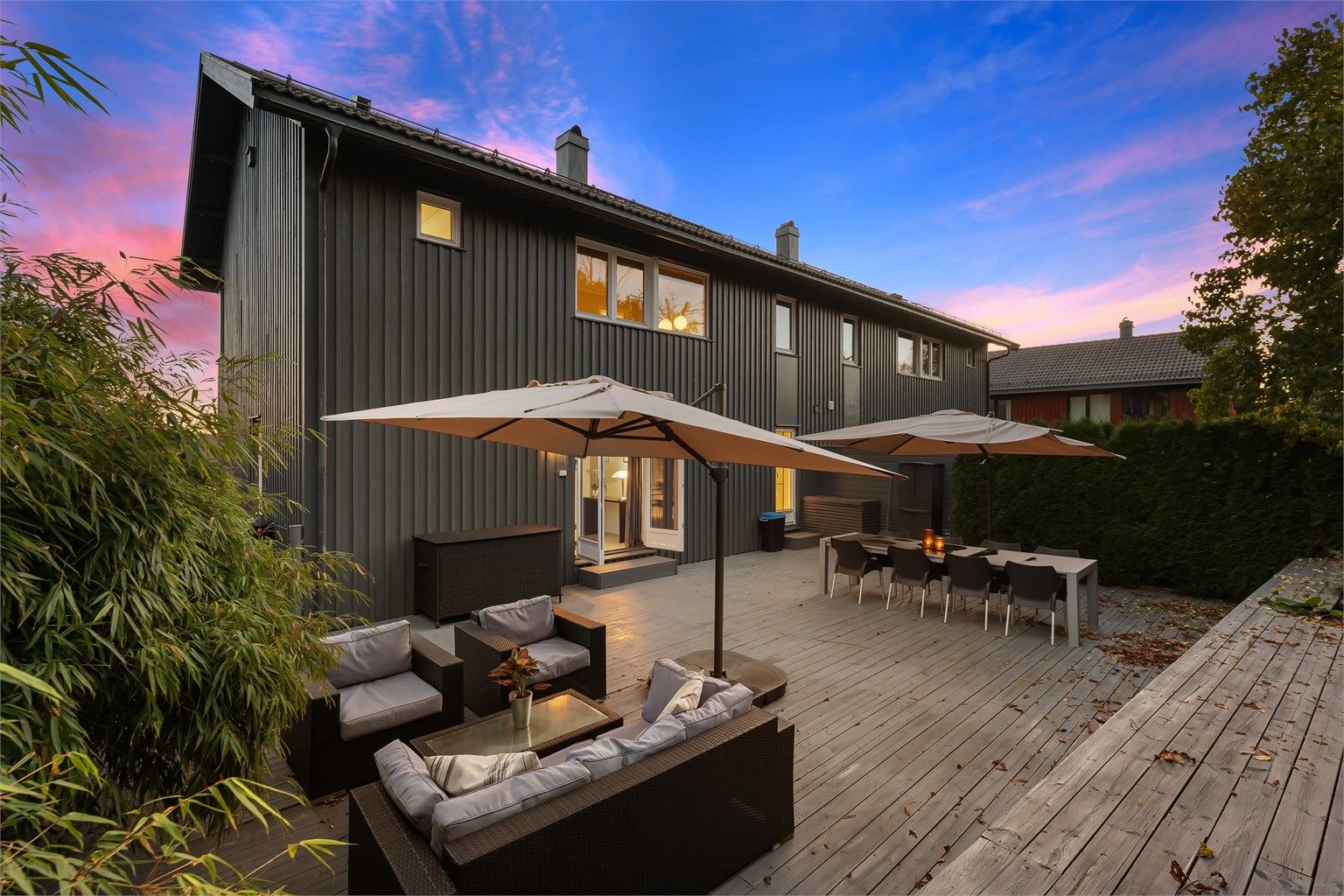 Huset går over tre etasjer og byr på en gjennomtenkt planløsning med 4 soverom, 3 stuer, 3 bad og eget vaskerom, ideelt for en aktiv familie.
