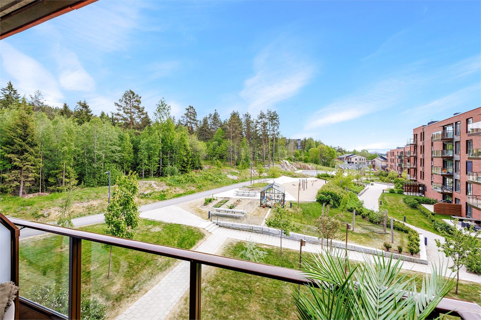 - Skjermet sydøstvendt balkong med fin utsikt over sameiets fellesområder