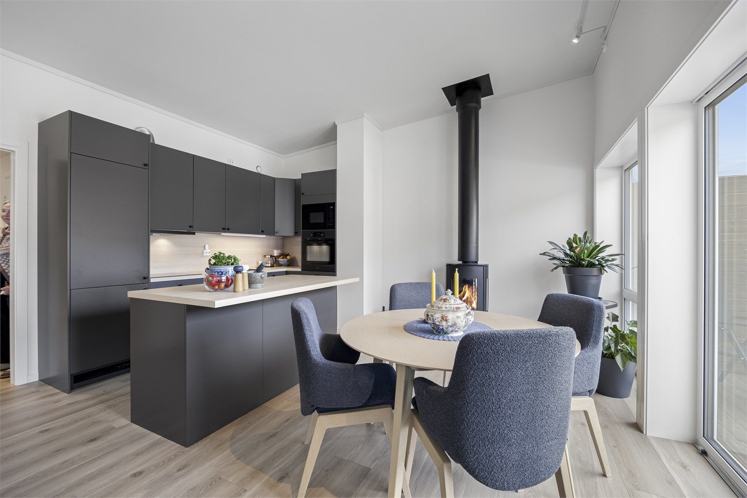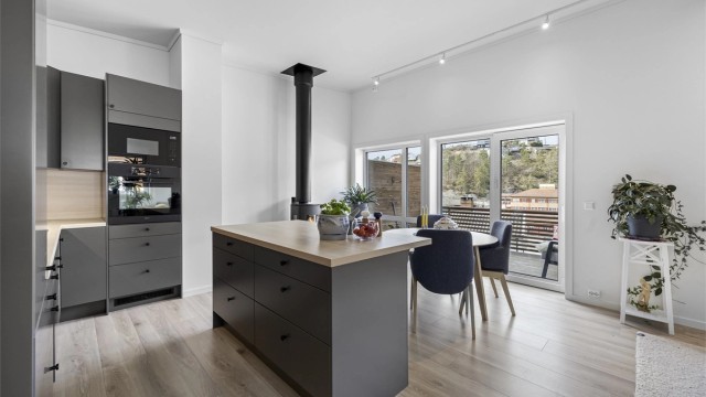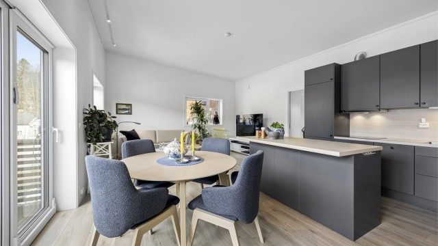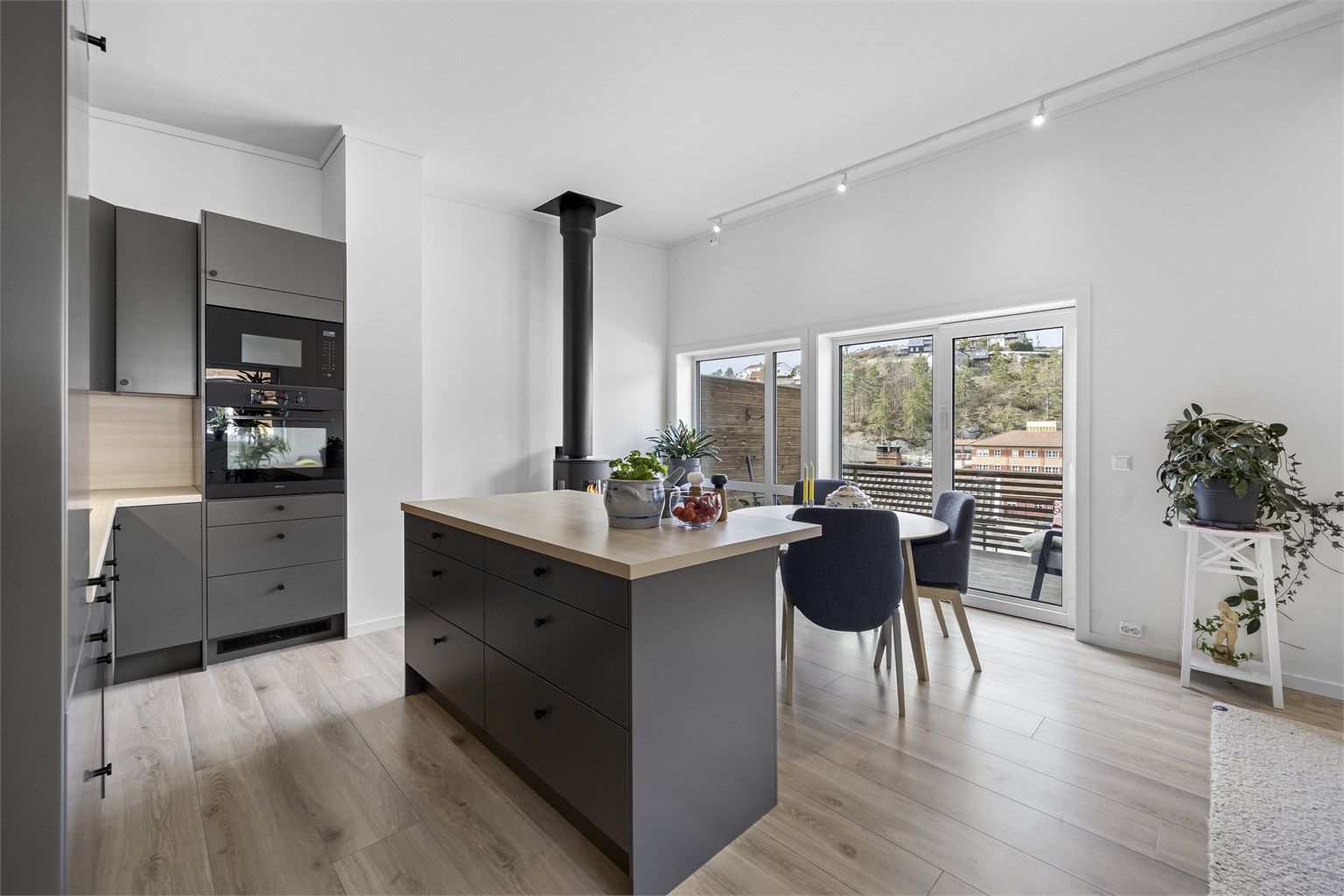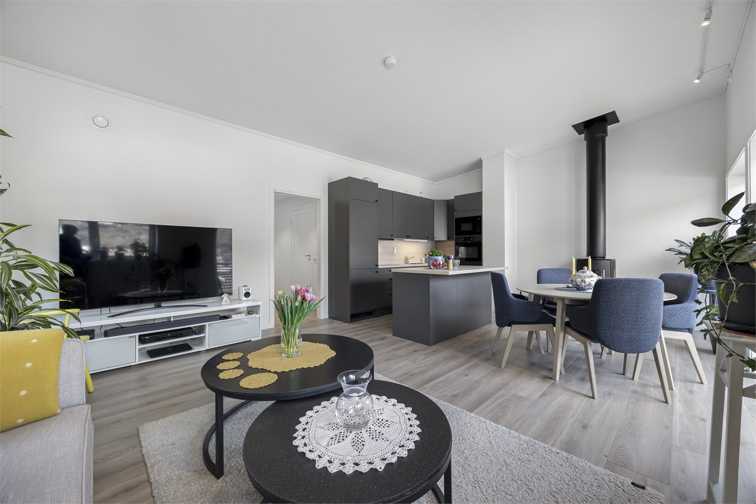 Høydepunkter:Ny fra 2023 med balansert ventilasjon To balkonger på til sammen 17 m² Kjøkken med integrerte hvitevarer Flislagt bad med gulvvarme Egen p-plass i carport, samt ekstra parkeringsplass nedenfor (tinglyst til seksjonen) Peisovn i stuen for ekstra hygge Selveier uten fellesgjeld