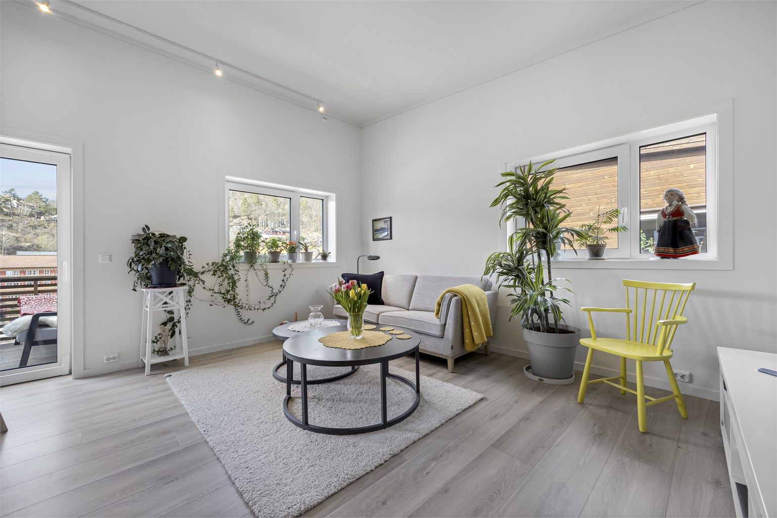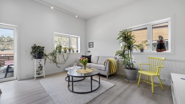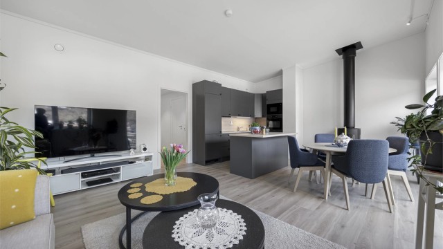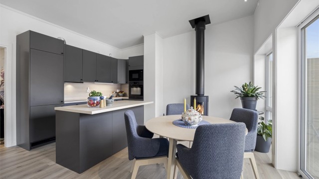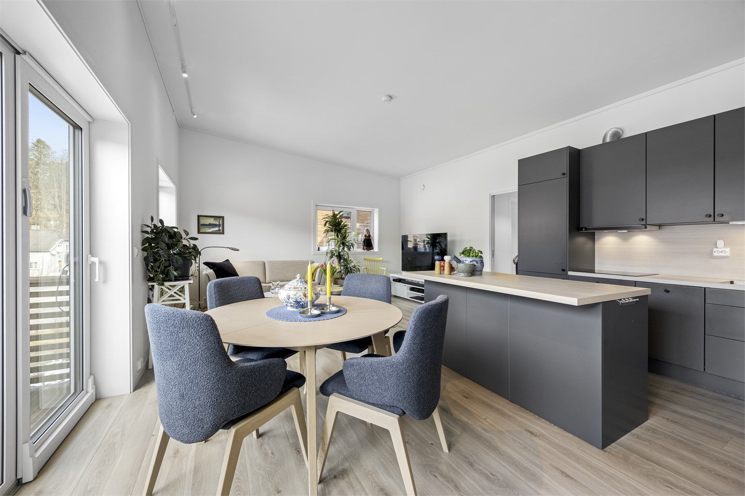 Høydepunkter:Ny fra 2023 med balansert ventilasjon To balkonger på til sammen 17 m² Kjøkken med integrerte hvitevarer Flislagt bad med gulvvarme Egen p-plass i carport, samt ekstra parkeringsplass nedenfor (tinglyst til seksjonen) Peisovn i stuen for ekstra hygge Selveier uten fellesgjeld