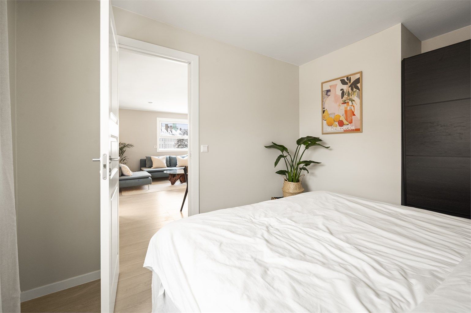 Dette er en lys og delikat 3-romsleilighet med sentral og attraktiv beliggenhet. Leiligheten har en god planløsning som består av en entré, bad, to store soverom i hver sin ende, og stue med åpen kjøkkenløsning. Fra stuen har man utgang til en sørvendt balkong på 9 kvm med mye sol.