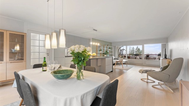 En lys, lekker og svært tiltalende 4-roms toppleilighet med god standard, gjennomtenkt planløsning og store vindusflater som rammer inn en vakker, langstrakt utsikt. Her bor du i et ettertraktet nabolag med grønne, bilfrie utearealer og kort gangvei til skole, barnehager, idrettsanlegg og buss. Kort vei til både Rykkinn Senter, Bærums Verk og flotte turområder i Eineåsen og ved Glitredammen. Garasjeplass med elbillader samt varmtvann og internett/TV er inkludert i felleskostnadene.