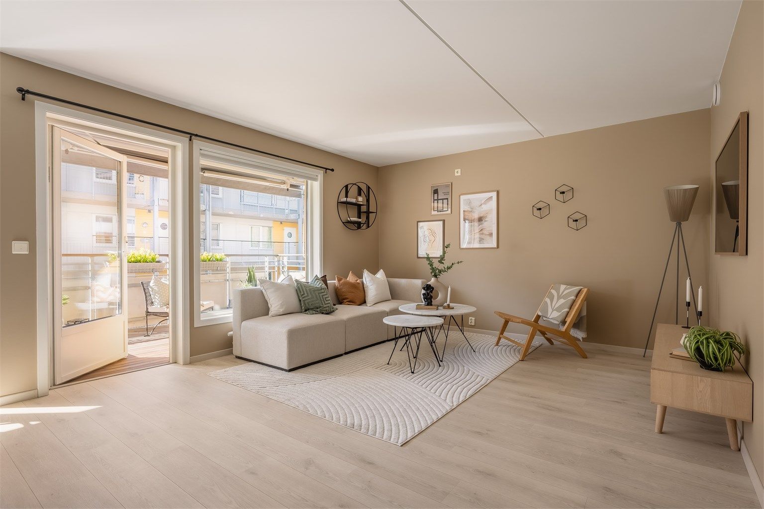 Åpent og luftig oppholdsrom av god størrelse. Det første som møter deg er store vindusflater over en vegg, som skaper et herlig lyst rom. Stuens utforming gjør at du enkelt kan innrede i ulike soner. Her er det mer enn nok plass til en romslig sofagruppe med tilhørende salongbord og tv-seksjon, samt en hyggelig spisestue langs de store vindusflatene. Vegg- og himlingsflater er malt i lyse toner, med samme en-stavs laminat på gulv. Fra stuen er det videre adkomst til en solrik balkong, som skaper en herlig forlengelse av boligen hele sommeren!
