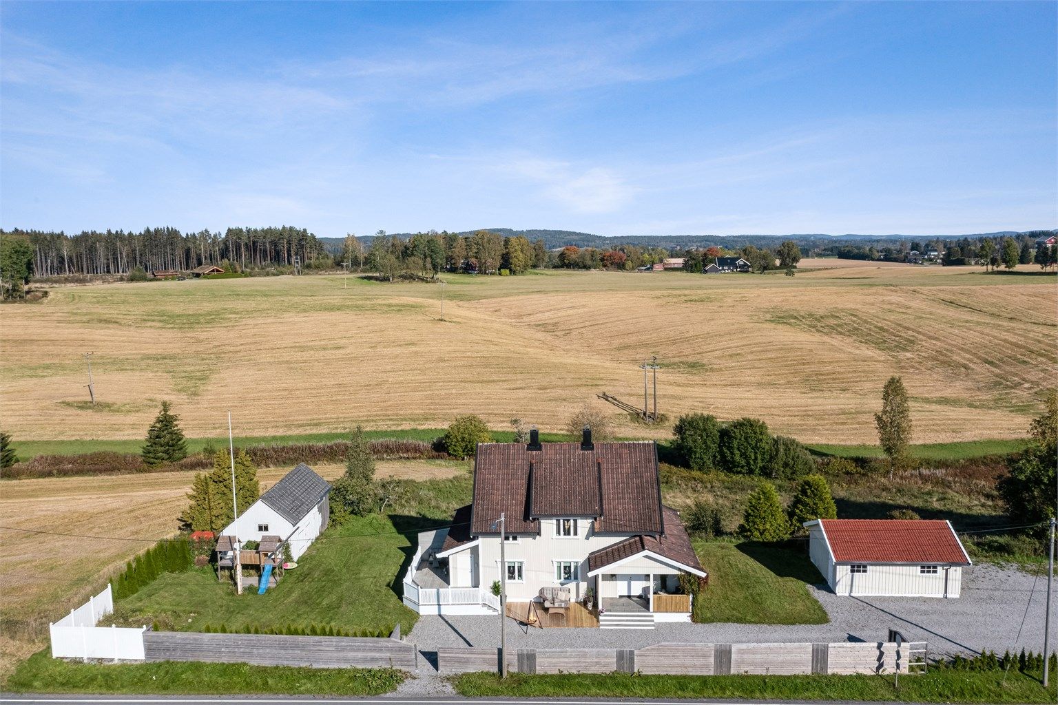 Landlig eiendom beliggende på stor tomt med stor parkeringsplass og med mulighet til utnyttelse av tomten til enkeltdyrehold, økologisk hage, frukttrær, bær, dyrke poteter, etc. Gode vekstvilkår!