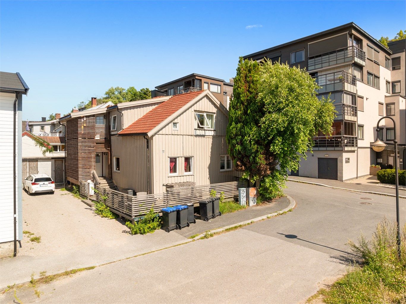 Fredelig nabolag med eldre trehusbebyggelse og rustikk sjarm