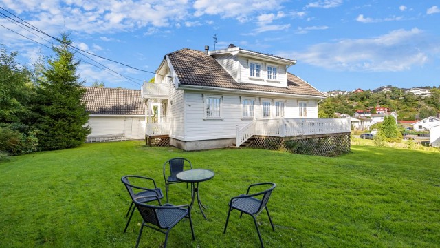 Fantastisk plassert enebolig med sol fra tidlig morgen til ca. kl. 21:00 midtsommers. Det tilhører en flott og romslig plen, samt plass til flere biler på egen tomt. Eiendommen ligger idyllisk plassert med flere usjenerte oppholdsplasser og en sentral beliggenhet til det meste. Fra eiendommen er det ca. 250 meter vei/sti til sjøkanten, hvor man finner den magiske sandstranden ved Strand Hotell. Fra eiendommen er det fantastisk utsikt til havgapet fra flere steder! Boligen er romslig og inneholder tre soverom, kjøkken, stue, loftstue, flere bodrom, to bad, vaskerom og mye mer. Garasjen krever utbedring for videre bruk. Uthuset som tilhører har betongdekke på gulv og har tidligere holdt duer.