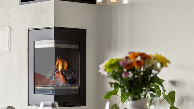 Elektrisk oppvarming i kombinasjon med vedovn i stue. Varmefolie i gang, deler av stue/kjøkken og varmekabler på bad.