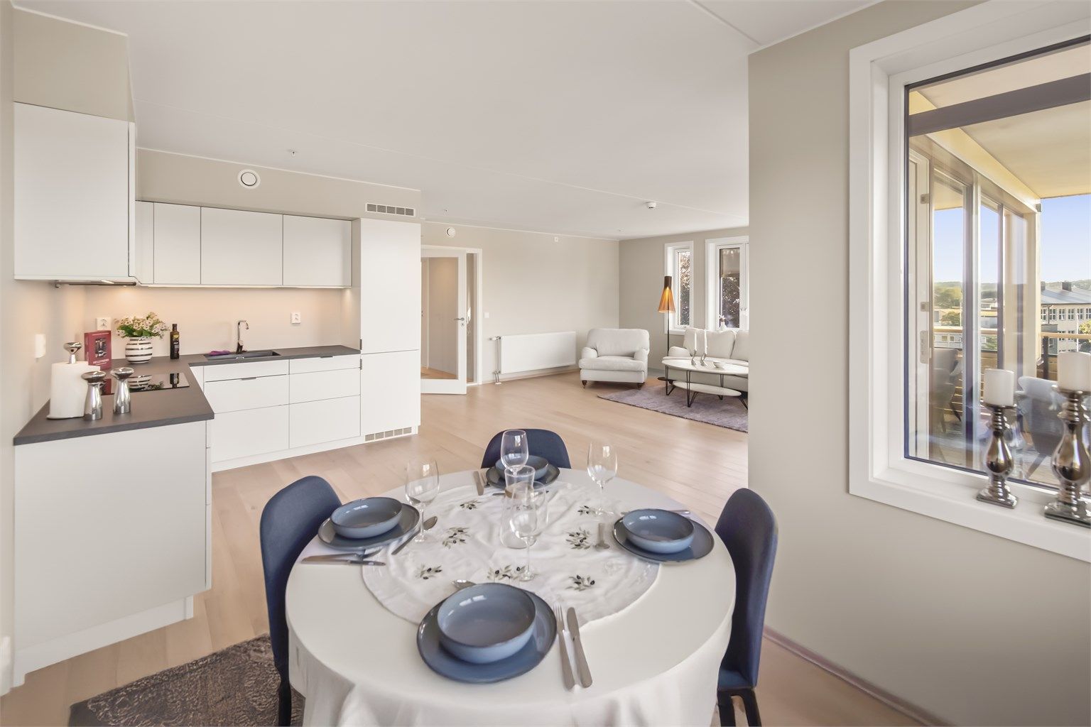 Denne helt nye og moderne leiligheten byr på en enkel livsstil og mange gode kvaliteter. Tilhørende parkeringsplass i garasjeanlegget i kjelleren med heis. Inngang til leiligheten som ligger i 4.etasje på enden av bygget fra en svalgang. Romslig entré/gang med mulighet for å sette inn skap/garderobe. Leiligheten har to fine soverom hvor et av de har adkomst til en balkong. Delikat og flislagt bad med opplegg for vaskemaskin. Stuen er meget romslig og har en åpen løsning mot kjøkkenet. Tidløst og pent kjøkken (Eventyrhus fra Byggmakker) med integrerte hvitevarer (Siemens). God plass til spisestue (evt et soverom nr 3). Leiligheten fremstår som delikat, tiltalende og har mange lysflater som gir en god følelse. En energieffektiv og fin leilighet som kan passe for mange!