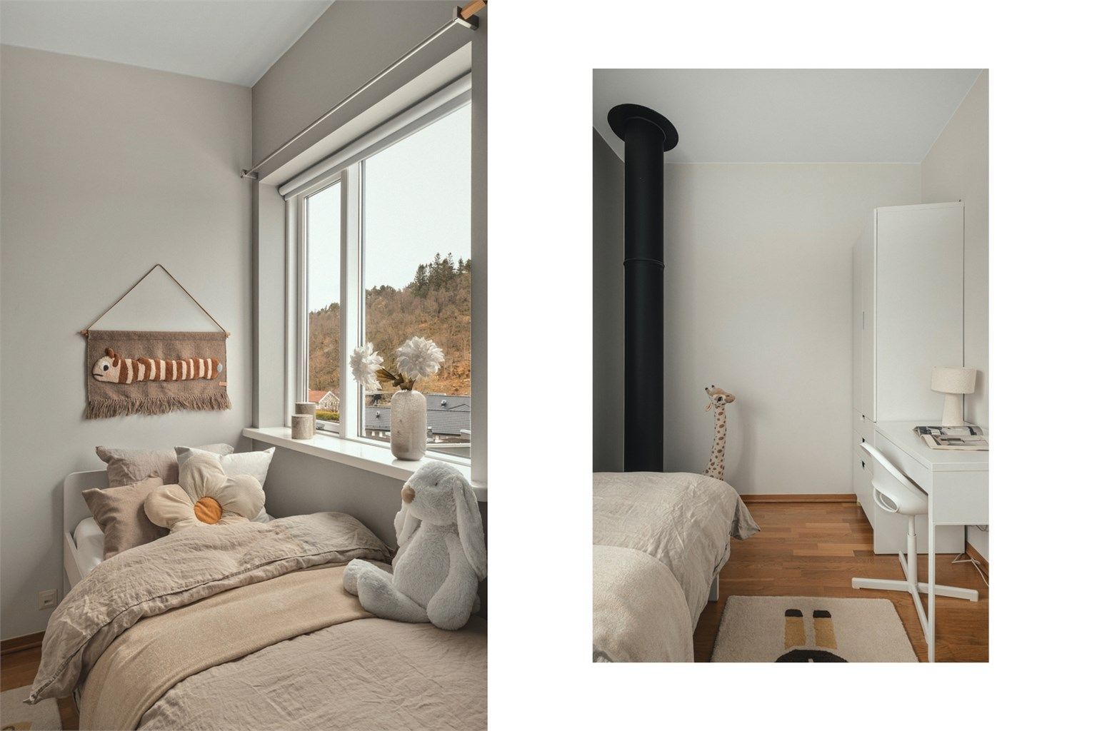 Soverom 2 har parkett på gulv, malte vegger og malt tak. Gjennomføringsrør for pipe.