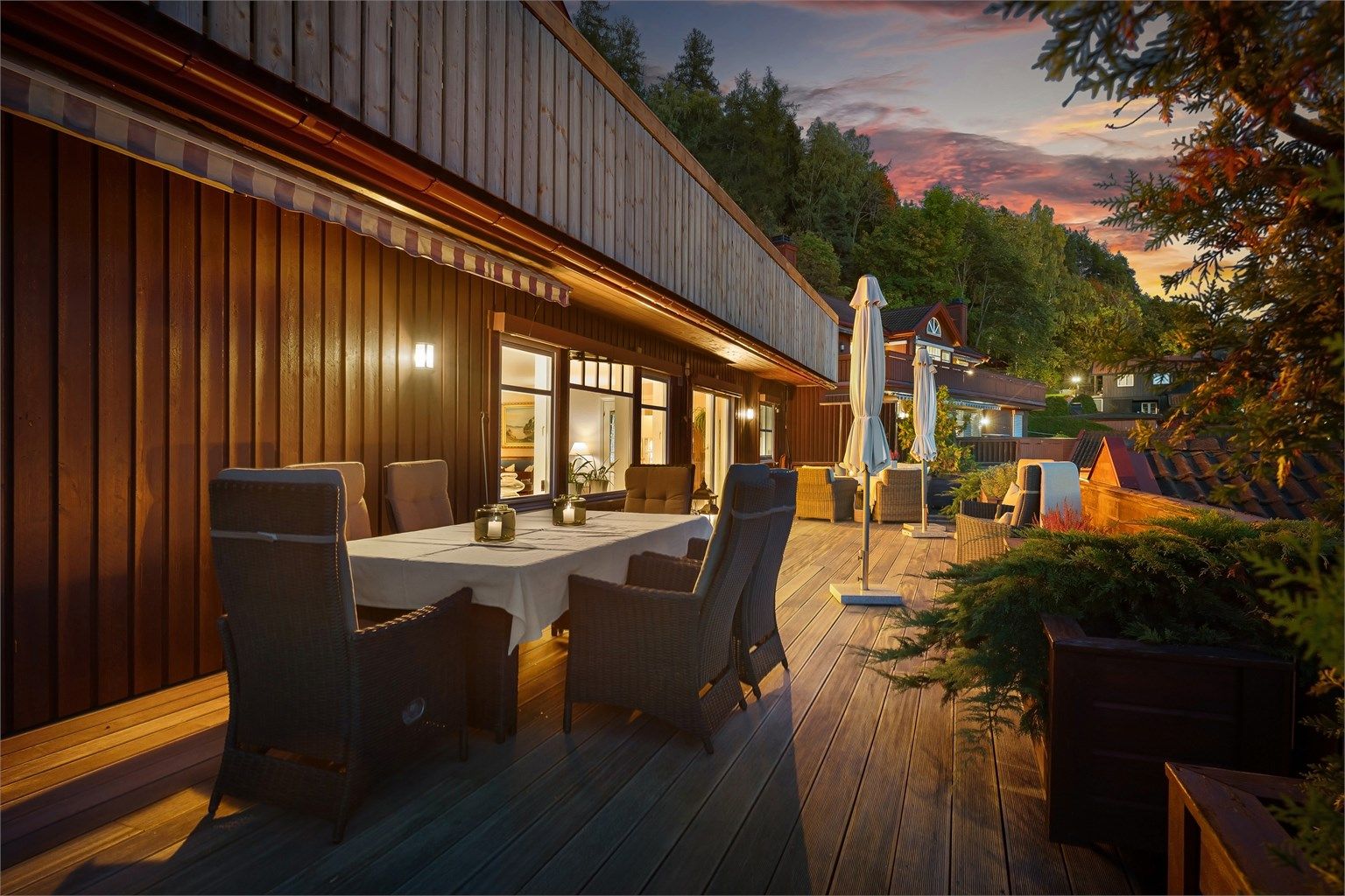 Stue: Romslig og lys stue med god plass til flere sosiale soner. Stue med sofaområde og to spiseplasser. Store vindusflater som gir godt med naturlig lys og utsikt. Flott peisinnsats i vegg med plate på gulv (selger opplyser om at ildstedet ikke har vært benyttet på 10 år), pent plassert i midten av rommet. Parkett på gulv, tapet på vegger og malt himling. Utgang til delvis overbygget terrasse på ca. 77 kvm med utvendig belysning, markise og terrassebord av "Balau" (hardt trevirke). Terrassen er solrik og har flott utsikt over byen fra høyden.