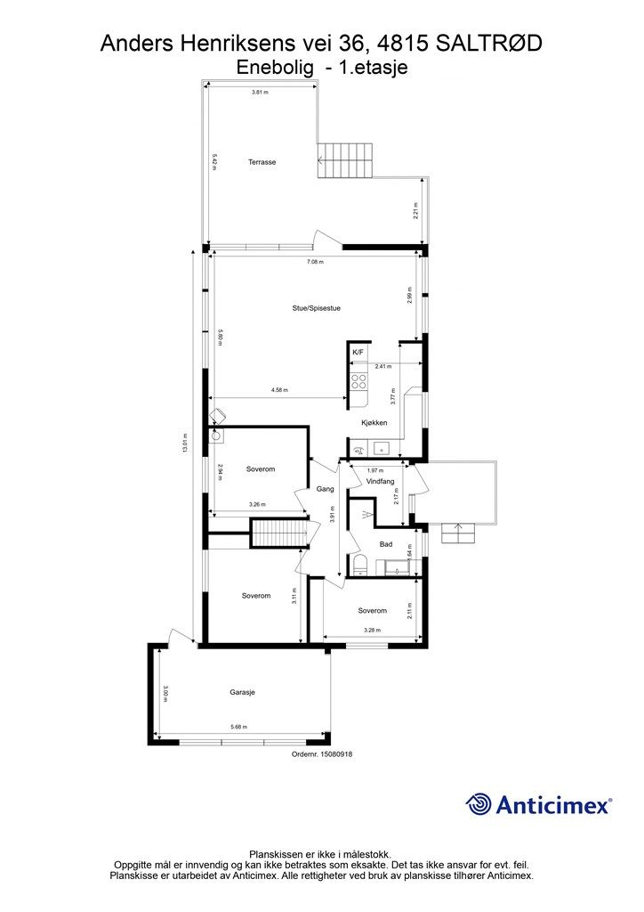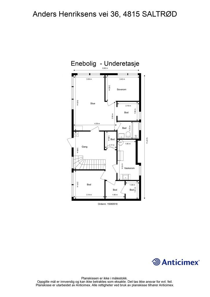 Vedlagte plantegninger er ikke målbare. De oppgitte arealer er hentet fra rapport med befaringsdato 24.04.2026 utført av Anticimex AS v/Halvard Grina. Arealene er beregnet og rom er definert etter dagens faktiske bruk, uavhengig av hva som er godkjent av bygningsmyndighetene.