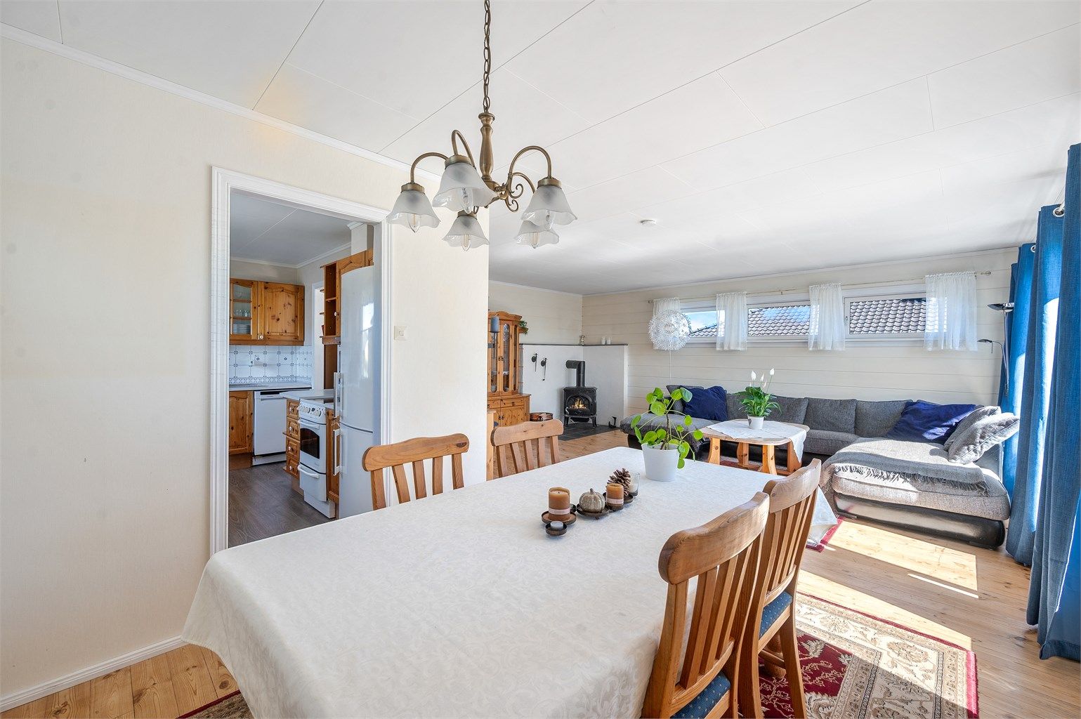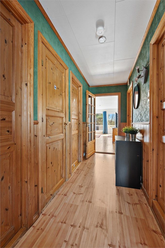 1. etasje 91 kvm: Vindfang, gang, tre soverom, bad, kjøkken og stue/spisestue.