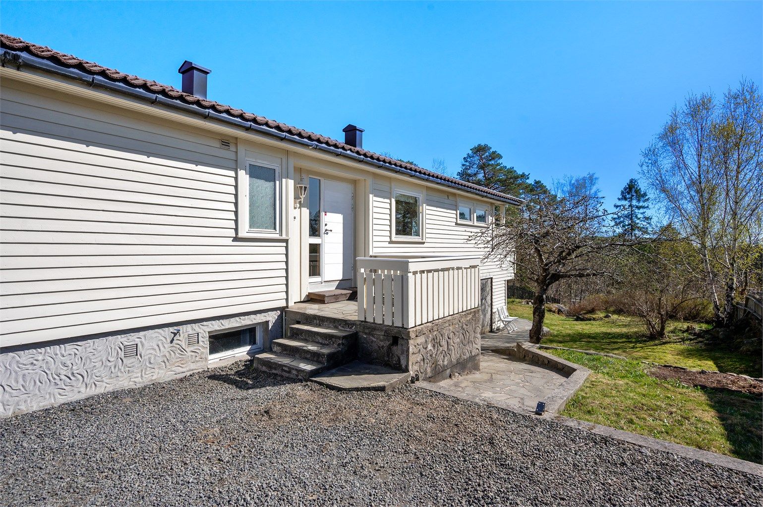 Tomten er opparbeidet med gruslagt innkjørsel, beplantning, brudskifer og flere fine uteplasser.