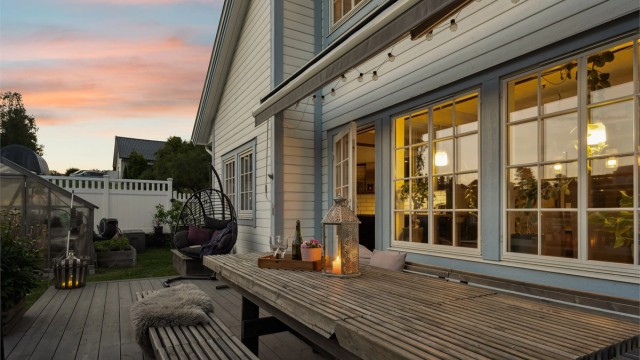 Tomten er pent opparbeidet med noe gressplen med plass til bla. trampoline, sandkasse og drivhus. Stor, usjenert platting med gode solforhold.