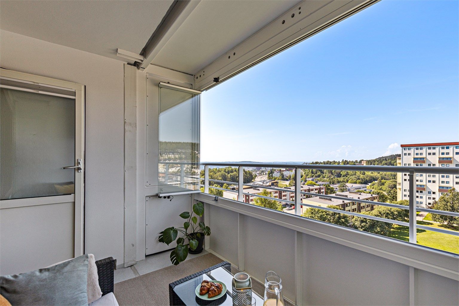 Boligens andre balkong er også av god størrelse og er innglasset. Her får du en perfekt forlengelse av rommet på årets varmere dager, og innglassingen forlenger bruken til større deler av året.