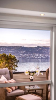 Når du kommer inn i stuen er det flere høydepunkter. Man legger med en gang merke til de store vindusflatene mot altanen og den nydelige utsikten. Her får man full kontroll over innseilingen til Bergen og sommerstid treffer solen altanen fra ca. 10:00 og forsvinner ikke før ca. 20:30. I stuen er det et lyst og fint 1-stavs gulv og kasseramme i himling med downlights. Det er god plass til sofagruppe og spisebord i stuen og den åpne kjøkkenløsningen gjør at man har god kontakt med rommet når man har gjester.
