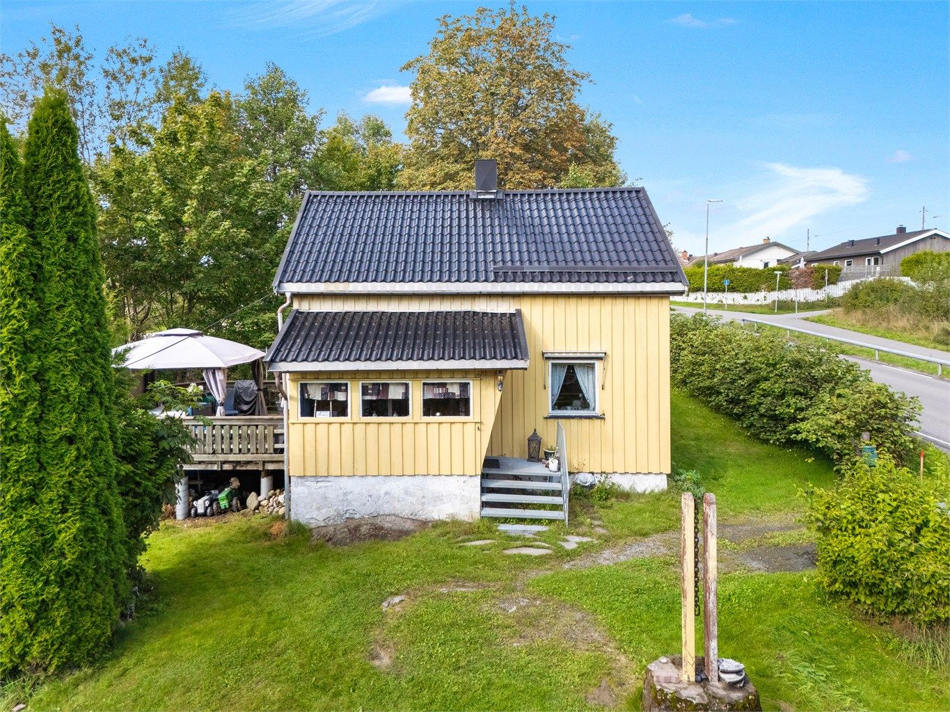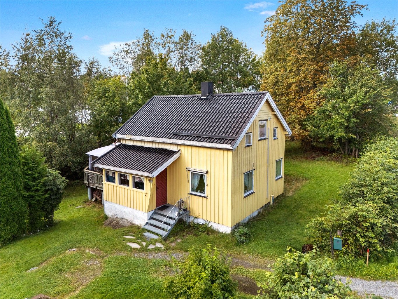 Eiendommen ligger på en romslig og frodig tomt med god plass til hage, lek og uteområder.