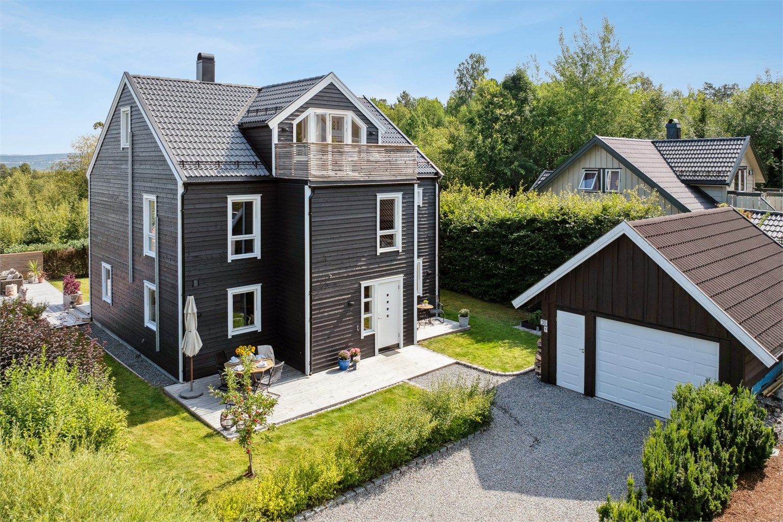 Boligen er romslig og innholdsrik, med solrike markterrasser, to balkonger, åpen stue- og kjøkkenløsning, peisovn og en pent opparbeidet hage. Her får du tre stuer fordelt på etasjene, et moderne kjøkken, 5 soverom (Ett rom kan enkelt tilbakeføres til to separate rom, og et ikke godkjent til varig opphold), samt to smakfulle bad. Parkering i garasje og på egen gårdsplass.